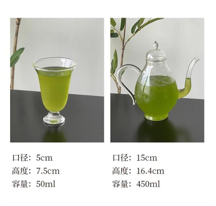 高品質耐熱ガラス製の450ml茶壶と50mlの茶わん2客がセットになった実用的アイテムです。