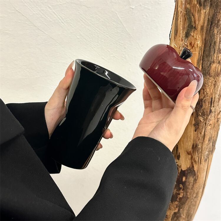 この手描き釉下彩マグカップは、赤と黒のキレイなコントラストに、スネークアップル(蛇果)の模様が活きたデザイン。