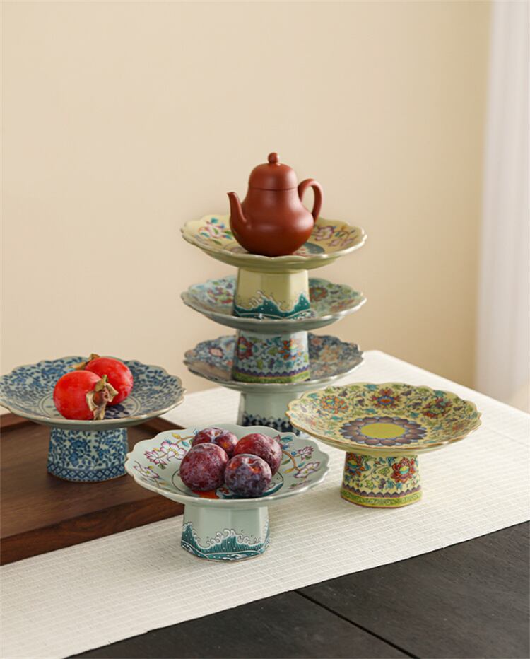白磁陶器 手描き七宝焼風 高台付き盛り皿 ドライフルーツ・お菓子用 N2JY2025072512 :dodo