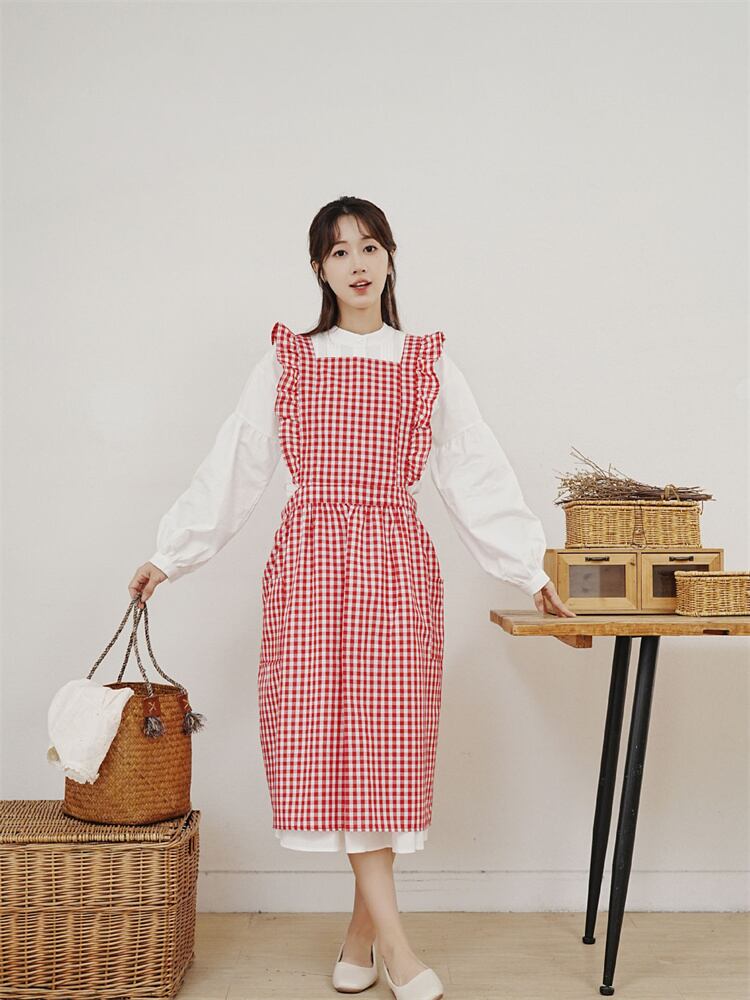 レトロ調チェックエプロン ノースリーブワンピース フリルアクセント 大きい丈 N2JY2025080405 :dodo
