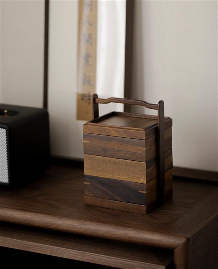 「職人が仕上げた天然木の三段重ね手提げボックスが新登場! 蓋付きデザインでお菓子やドライフルーツの湿気・虫をブロック。上質な木目がテーブルを優しく彩り、おもてなしシーンにぴったり; 各段は仕切り付きで、和菓子からナッツまで整理自在; コンコンパクトながら大容量、大切な方への贈り物にも最適です」
