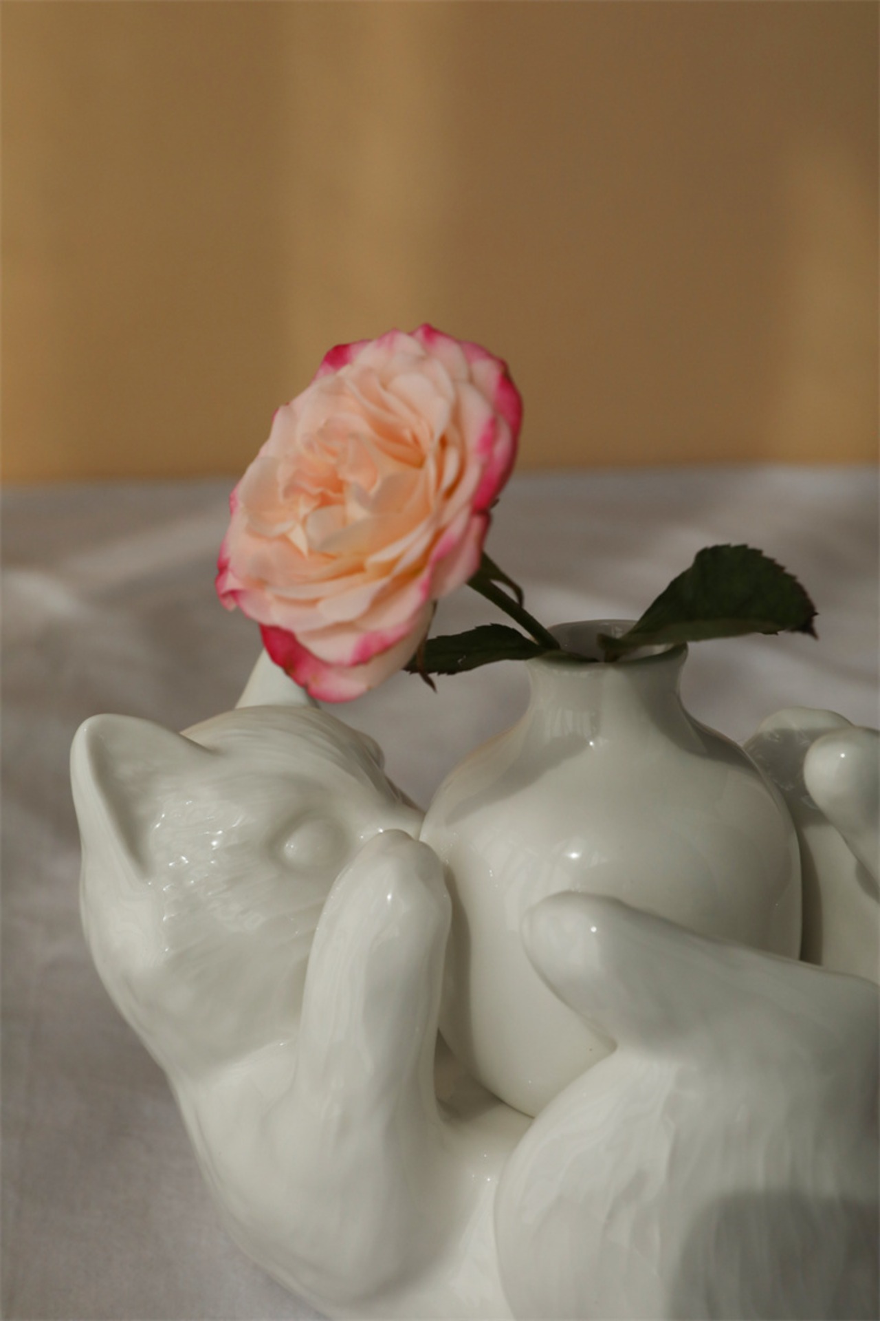 陶磁器製 組立花瓶 遊ぶ猫デザイン 芳香やグリーン栽培対応