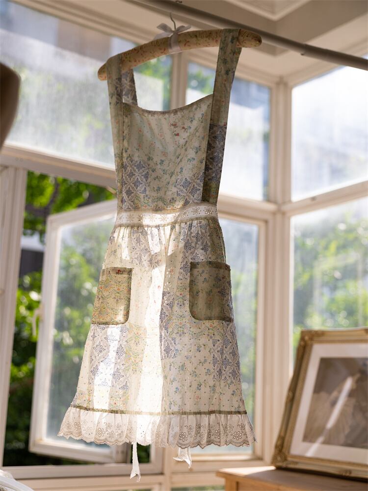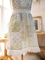 「韓国発;ウエスト絞りデザインでスタイルアップ!花柄とレースのダブルスカートが動くたびに優雅に揺れます;キッチンでお料理中もオシャレを楽しめる魔法のエプロン。