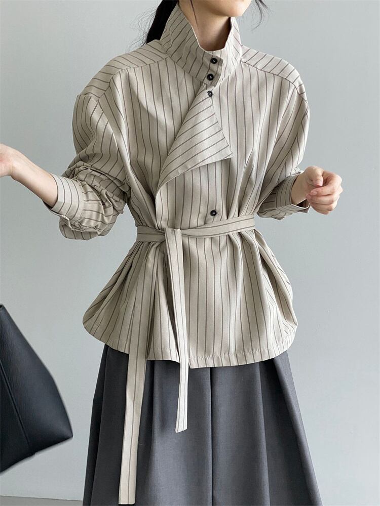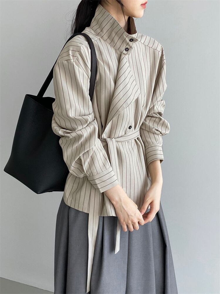 秋コーデ必須 通勤向け 細いストライプ 立襟 リボン結び ウエストシェイプ 長袖シャツ N2JY2025090611 :dodo
