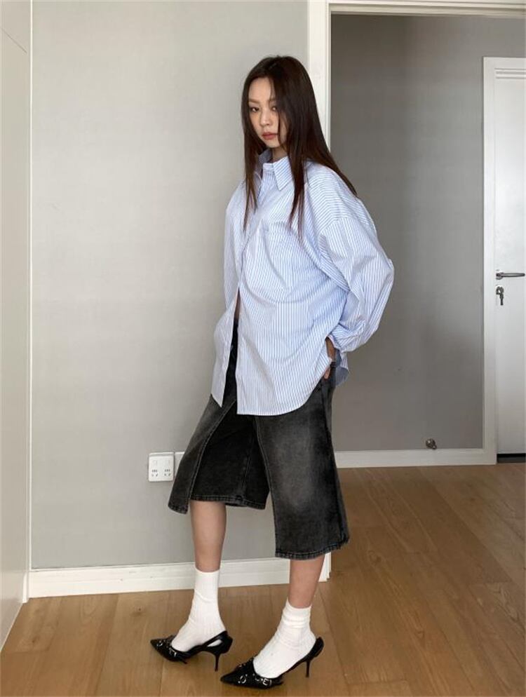 シンプルデザイン 縦縞 ミドル丈 ロングスリーブ ブラウス N2JY2025082004 :dodo