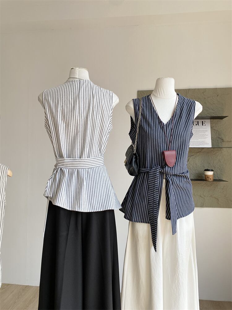 夏装 デザインVネック 結び紐付き ウエストシェイプ 無袖 シャツスタイル