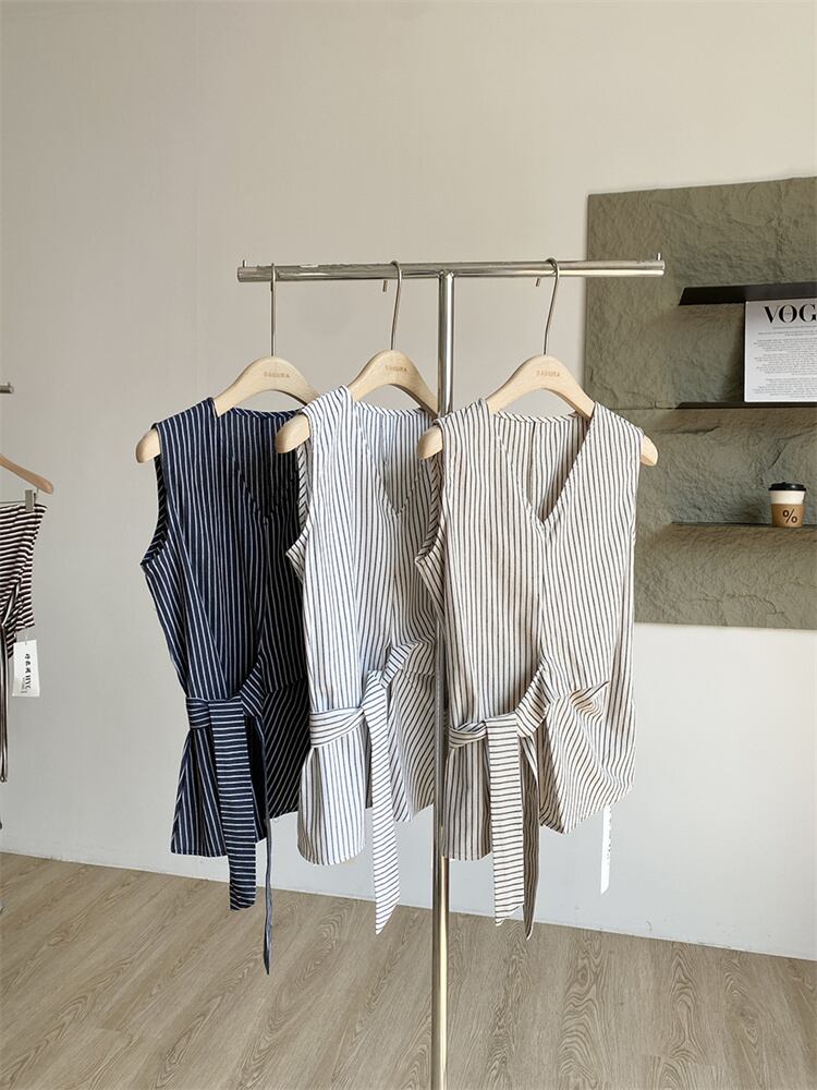 夏装 デザインVネック 結び紐付き ウエストシェイプ 無袖 シャツスタイル N2JY2025082003 :dodo