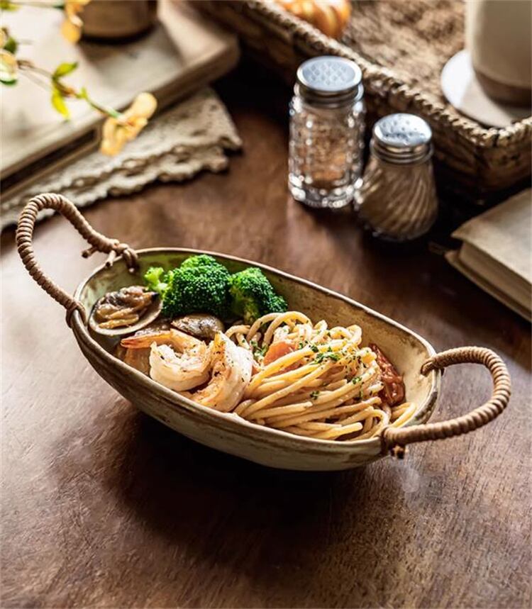 手編み麻縄付き楕円碗 粗陶の個性的食器 サラダ・フルーツ用 N2JY2025092211 :dodo