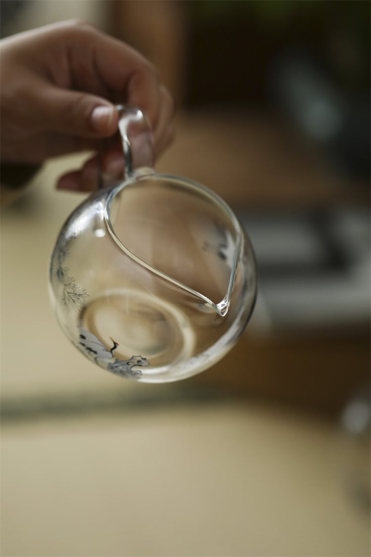 長寿の象徴「松鶴」が縁起良いガラス分茶器;シンプルながら存在感ある和モダンな見た目で、茶器コレクションの主役に! 汎用性が高く、紅茶・ウーロン茶・ハーブティーにも◎
