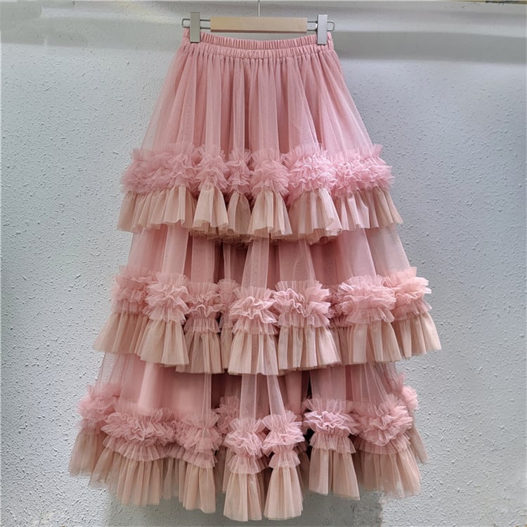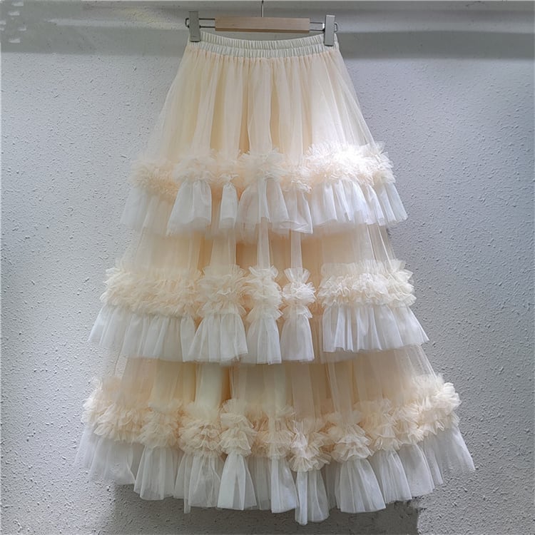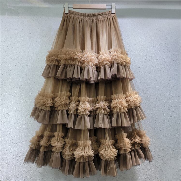 2025春コレクション ゴム締めウエスト レイヤードフリル フリルスカート Aライン ミッドレングス