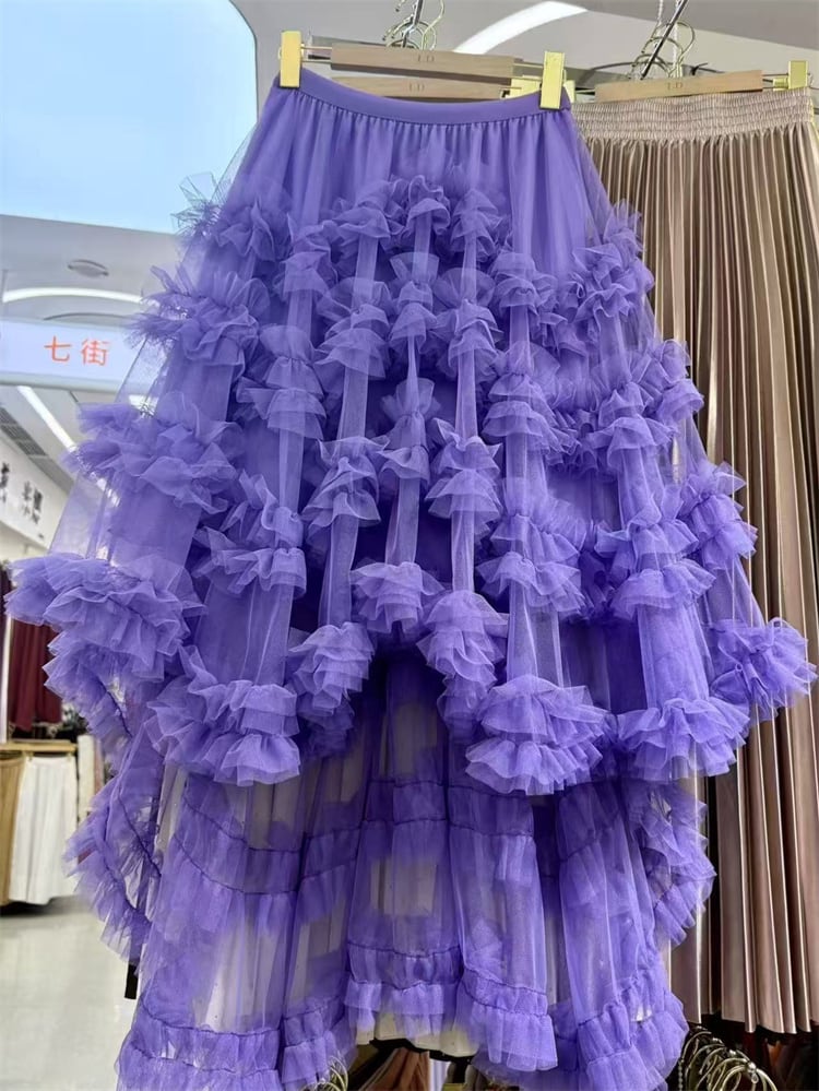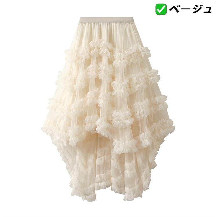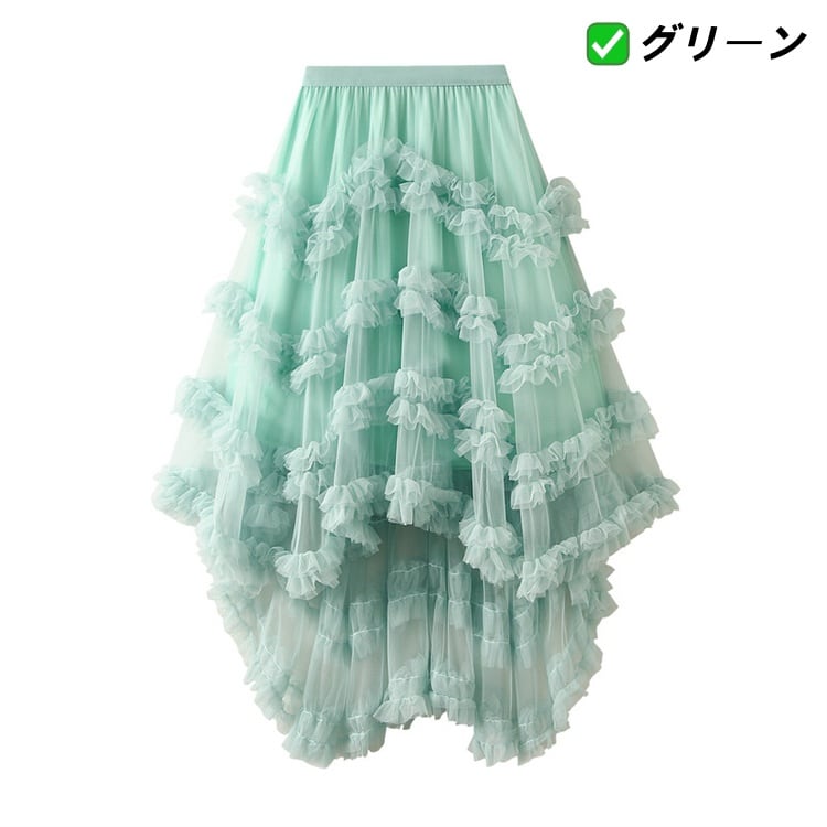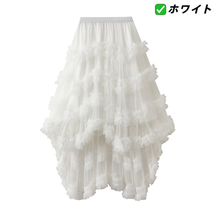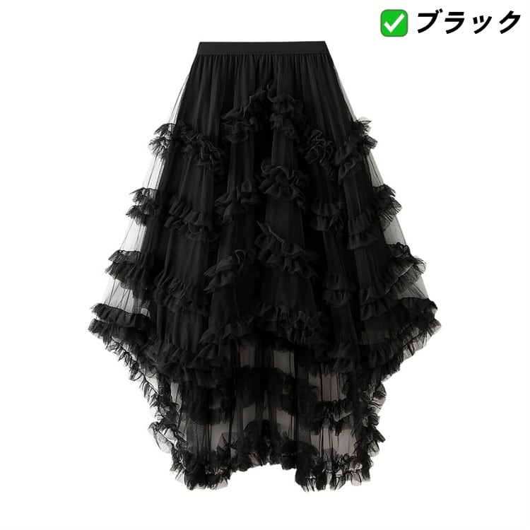 不規則フリル ネットロングスカート ゴムウエストバンド レイヤードデザイン 7色 N2JY2025100806 :dodo