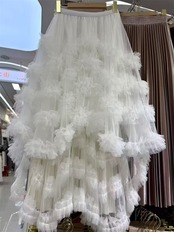 不規則フリル ネットロングスカート ゴムウエストバンド レイヤードデザイン 7色