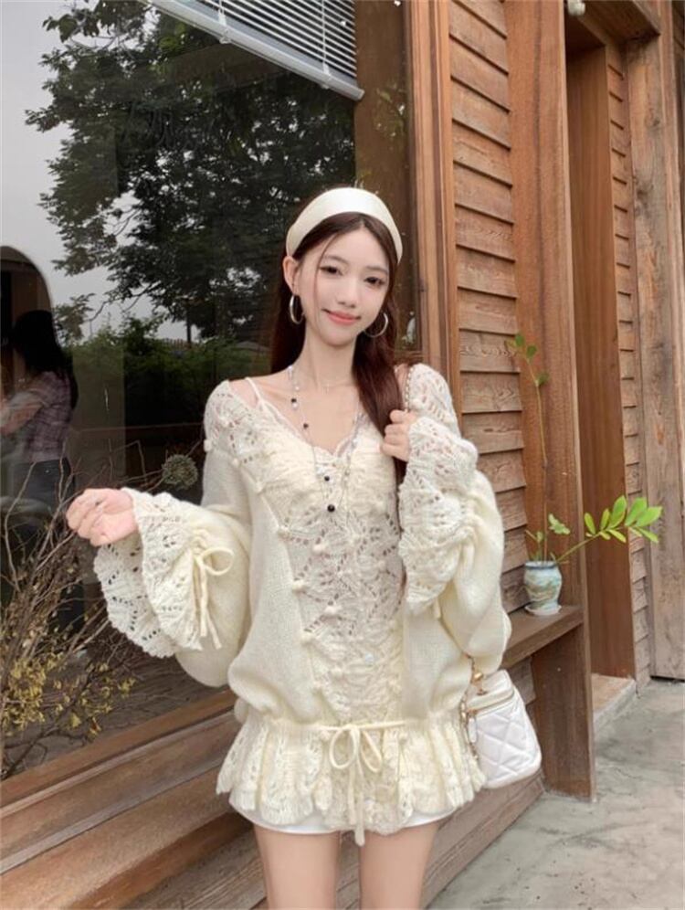 初秋 セーター Vカラー レース透かし 長袖 ゆるやか ダウンコード 肌に優しい