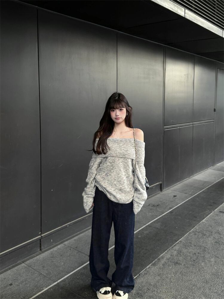 秋冬定番 一字肩 ニットトップス ゆったり着こなし 長袖デザイン