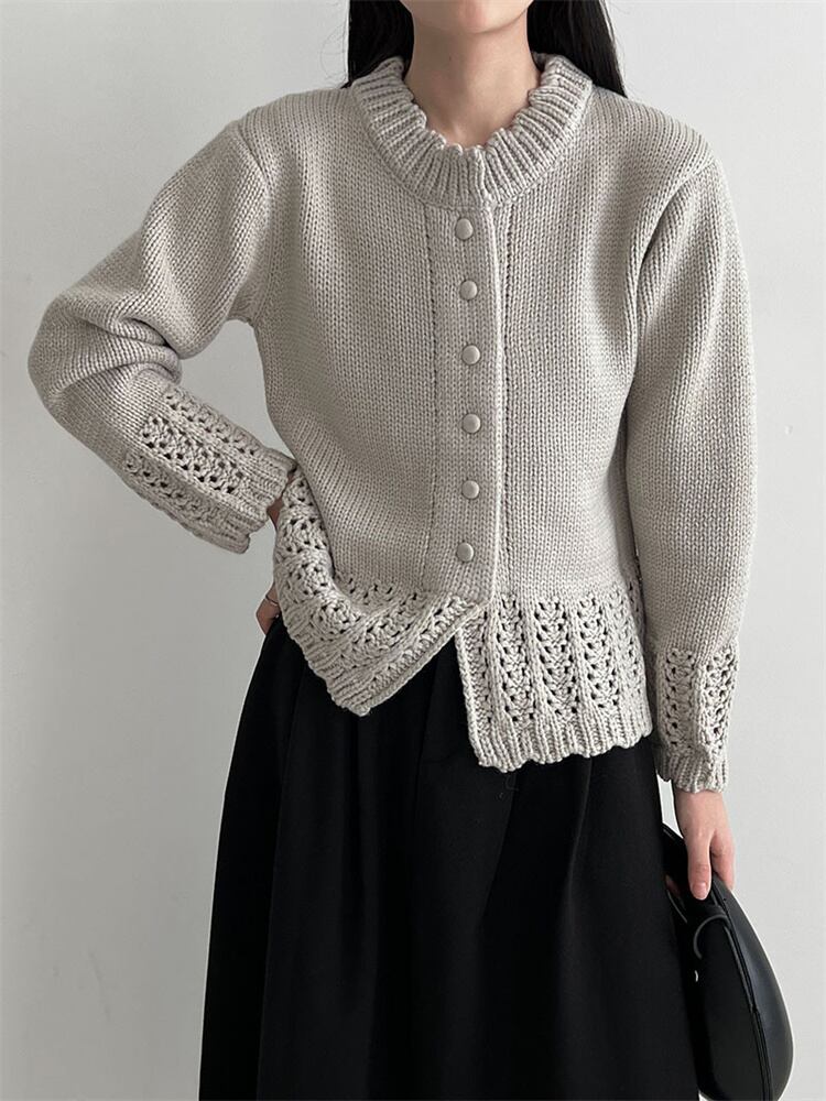 丸襟ニットカーディガン 2025秋冬 レースデザイン 新作 スタイリッシュ上着