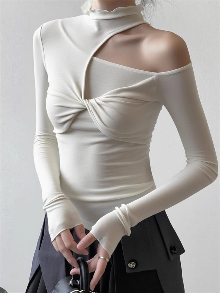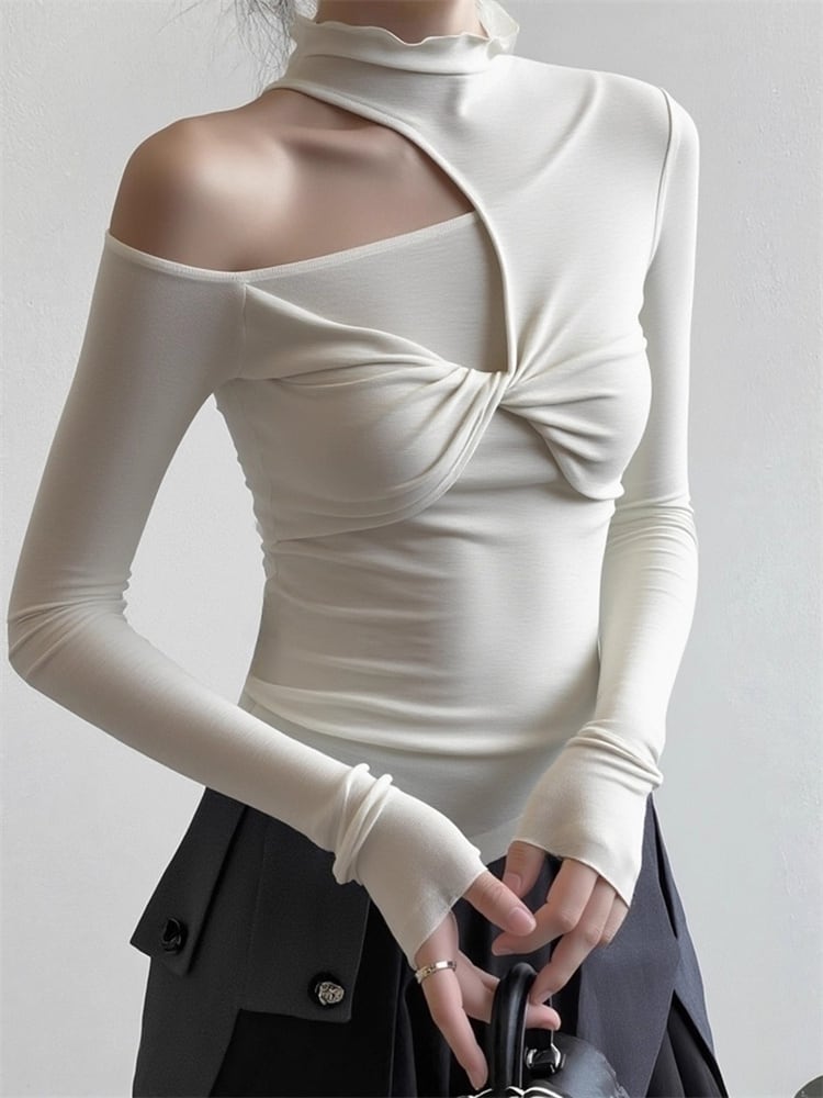 ねじれデザイン肩出し透かし編みレディーストップス 細身長袖インナー 秋冬コーデに映えるシルエットが魅力