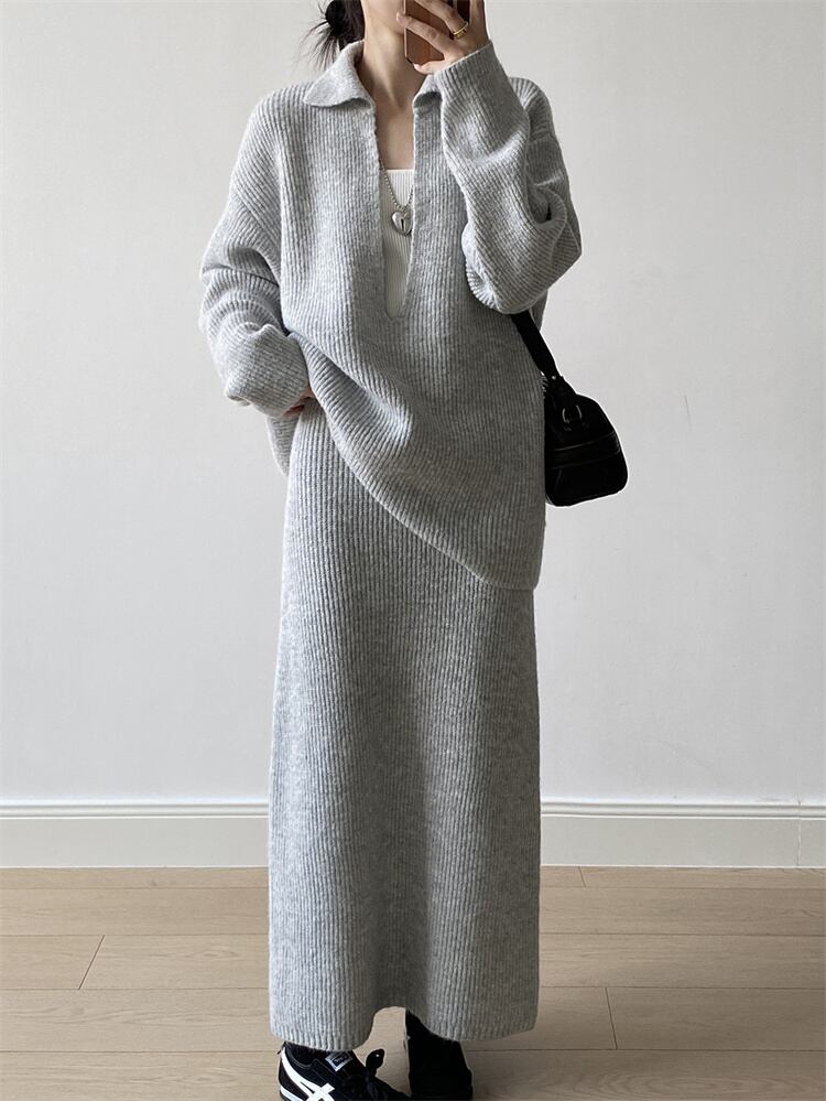 深Vネック ゆったりセーター ハイウエストニットロングスカートセット 2025秋 カジュアルコーーデ