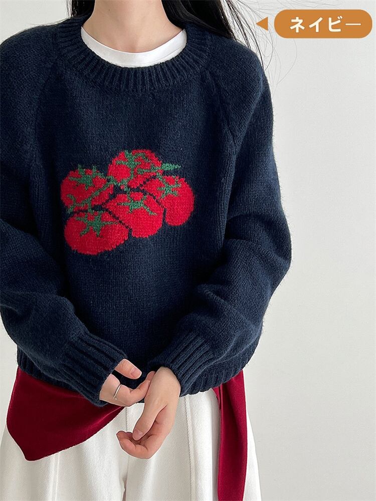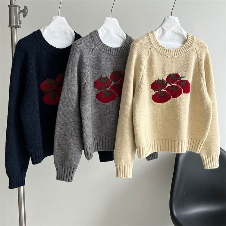 秋の新作ニット タイトフィットトマトモチーフ刺繍 丸首セーター 暖かく着心地よい3カラー N2JY2025112812 :dodo