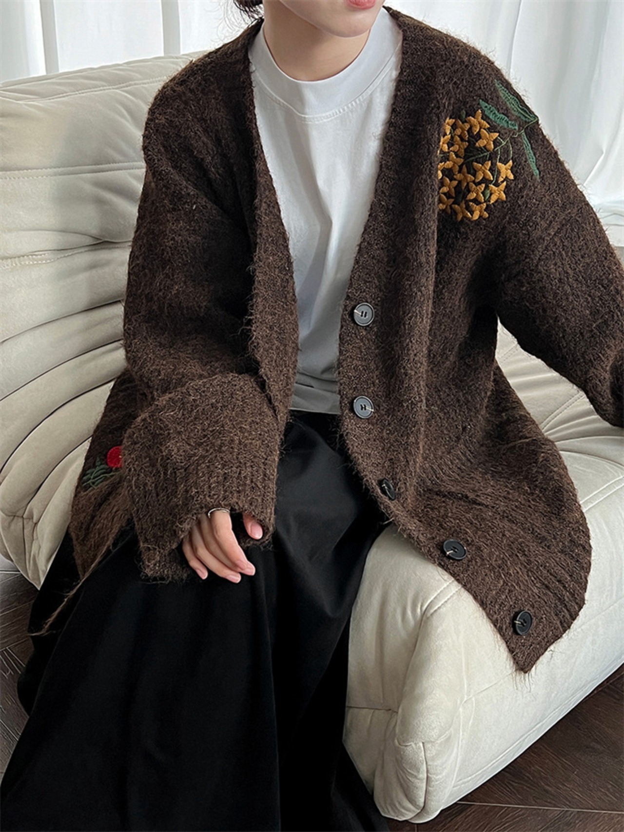 秋冬向けゆったりニットトップ リラックスデザイン 花刺繍 2025新作モデル