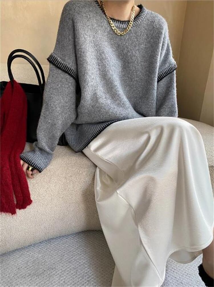ハンドメイドステッチで繊細な肌触り丸襟ゆったりリラックス風秋冬ニットトップス長袖セーター3色展開