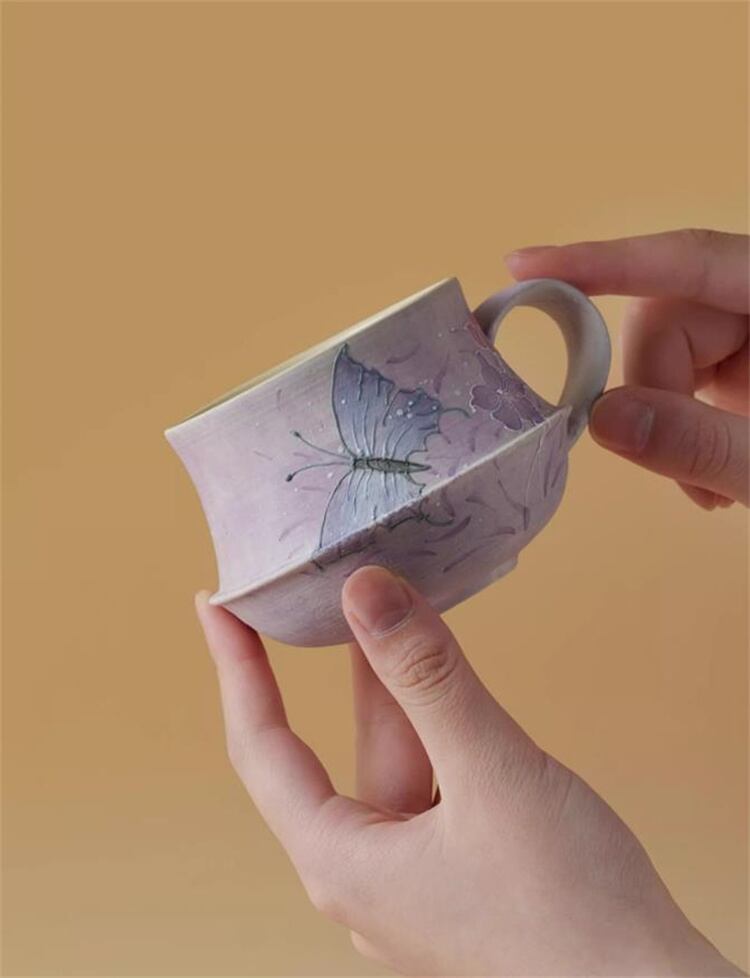 手描き紫色蝶模様の陶器ティーカップ 245ml 油絵風のアーティスティックなデザインが特徴 N2JY2025121603 :dodo