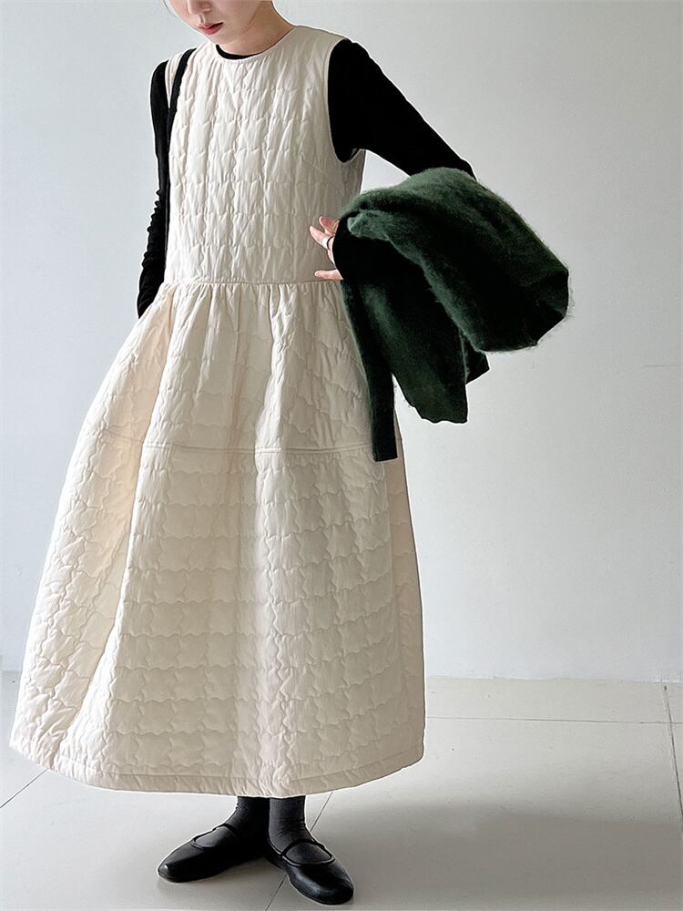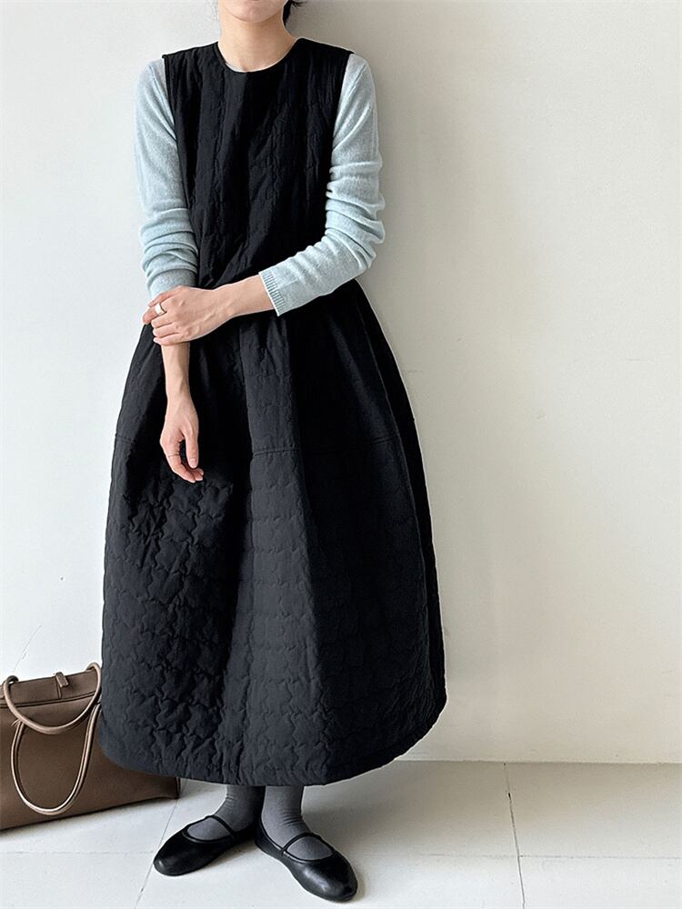 秋冬向け無袖ベストワンピース 厚手綿入りで暖か ゆったりロング丈 丸首 リボン付き カラー2色 N2JY2026011424 :dodo