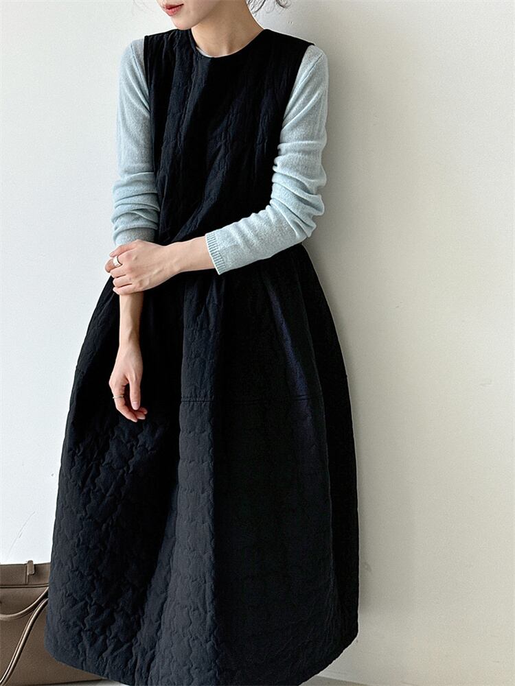 秋冬向け無袖ベストワンピース 厚手綿入りで暖か ゆったりロング丈 丸首 リボン付き カラー2色