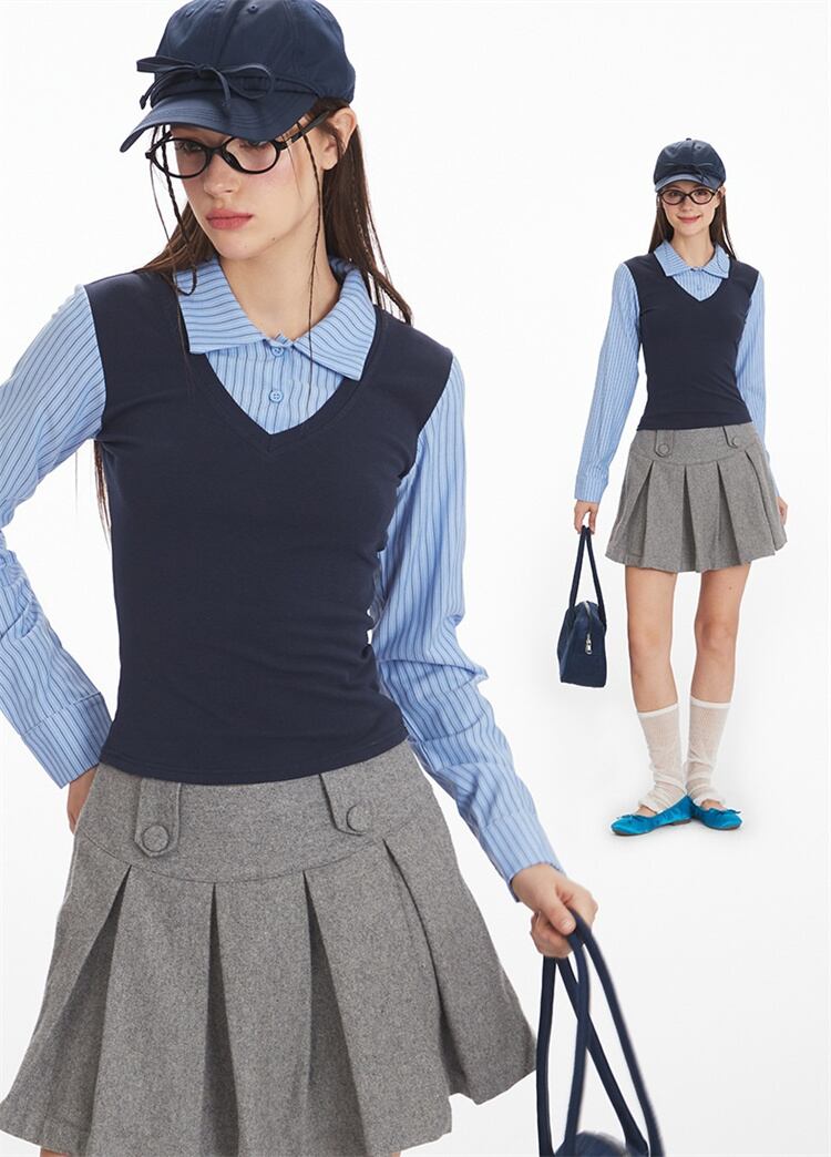 秋内搭に学園風偽二重トップス 長袖ショート丈で美ボディライン