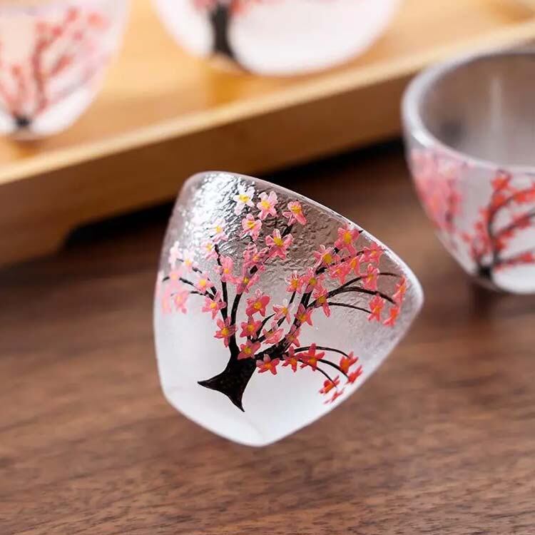 桜調ガラス製 酒器5点セット(壷 缸 コップ×4)温酒 冷酒兼用 軽量で扱いやすい