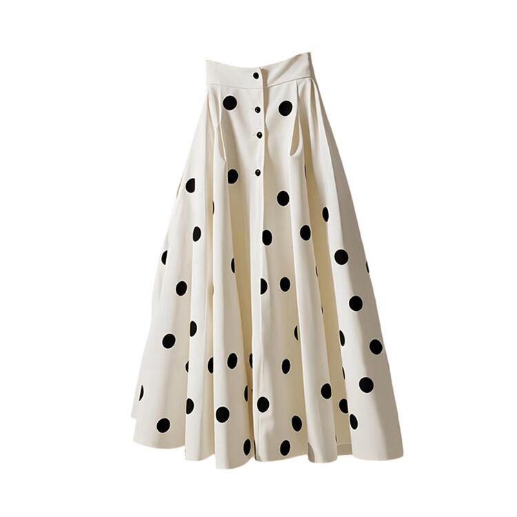 クラシカル水玉 欧米風 前ボタンデザイン ウエストスッキリ スタイルアップ ロングスカート