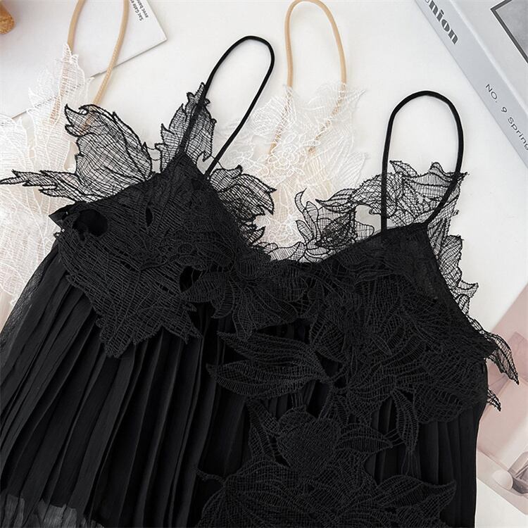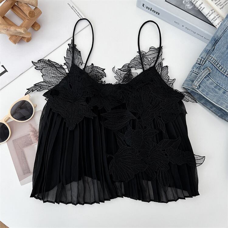 立体レース刺繍入り 黒のノンワイヤー吊り下げトップス 夏の外着にもインナーにも使える薄手デザイン N2JY2026032012 :dodo