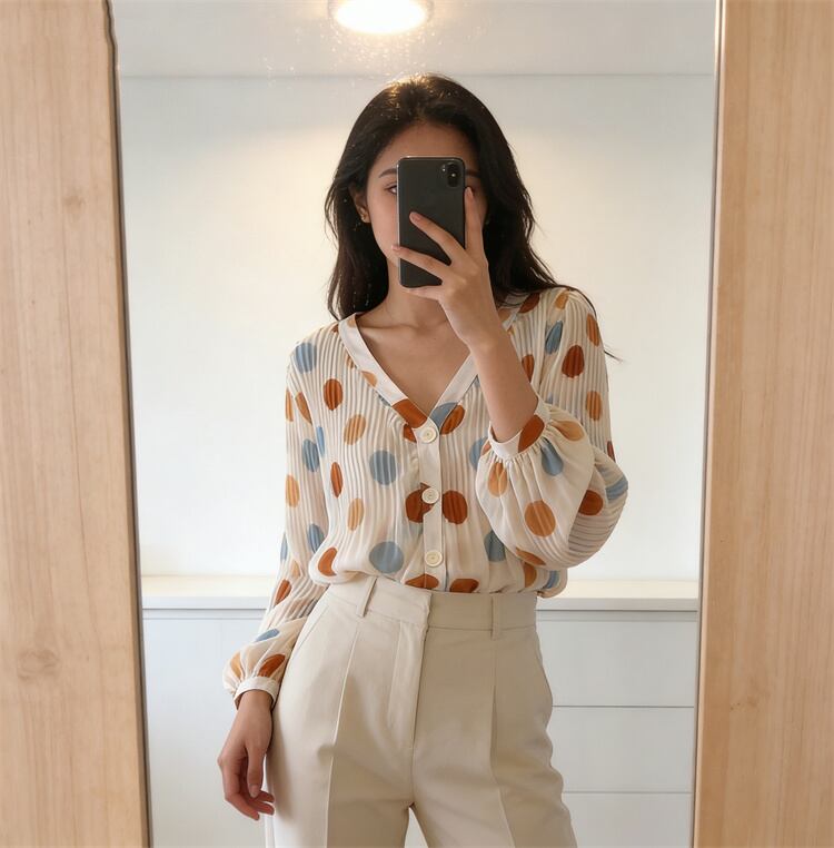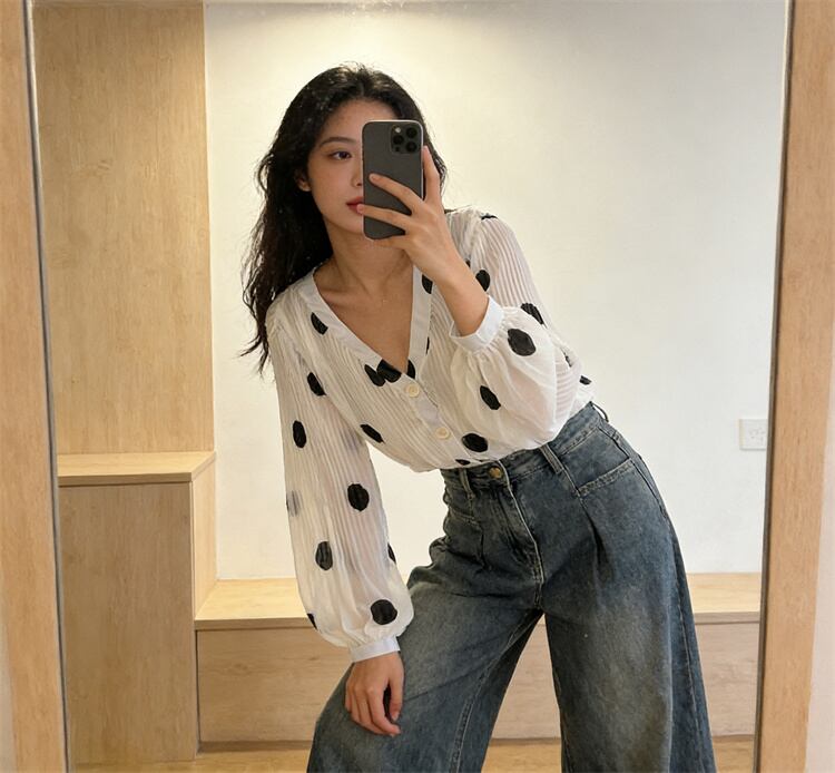 2026春夏トレンド レディース 通勤シフォンシャツ Vネック ドット プリーズ ランタンスリーブ N2JY2026032015 :dodo