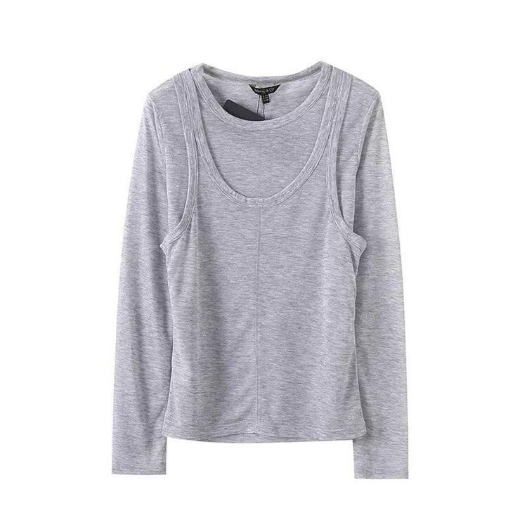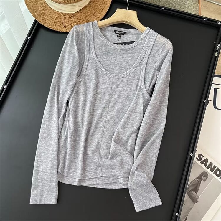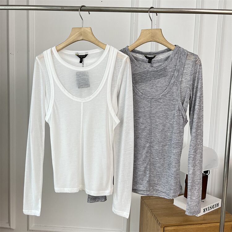 春物ニットインナー スリムフィット長袖 二重構造カットソー カジュアルトップス