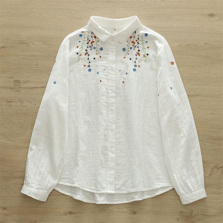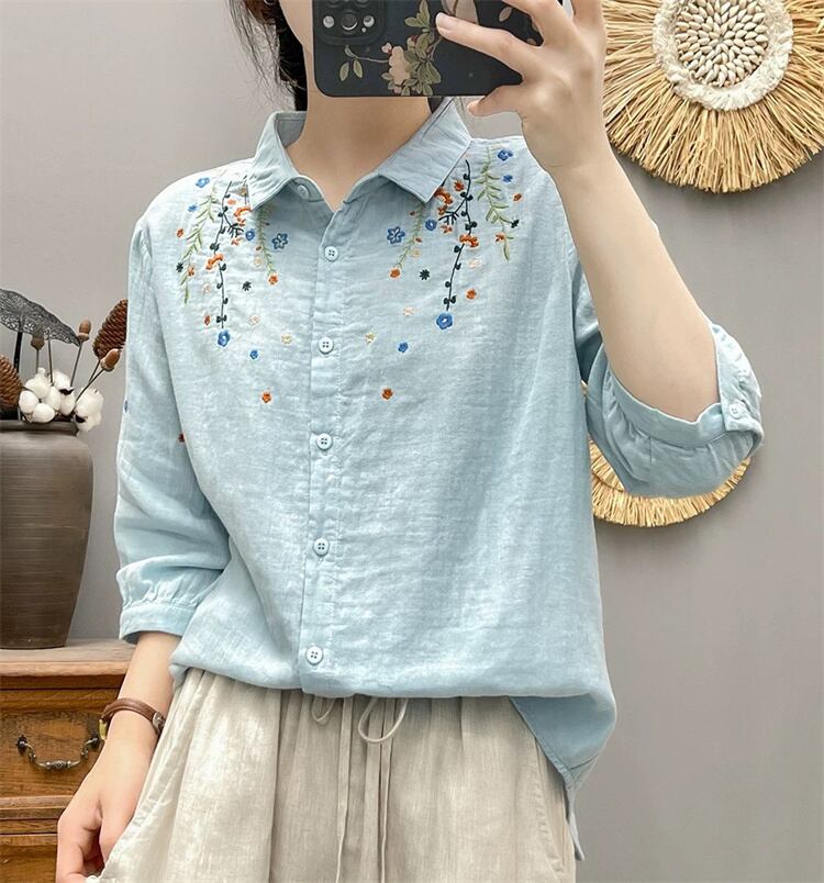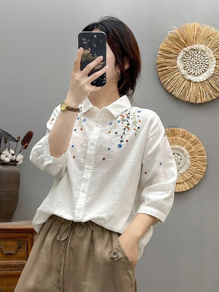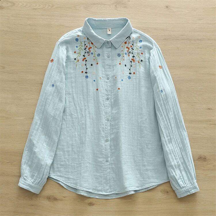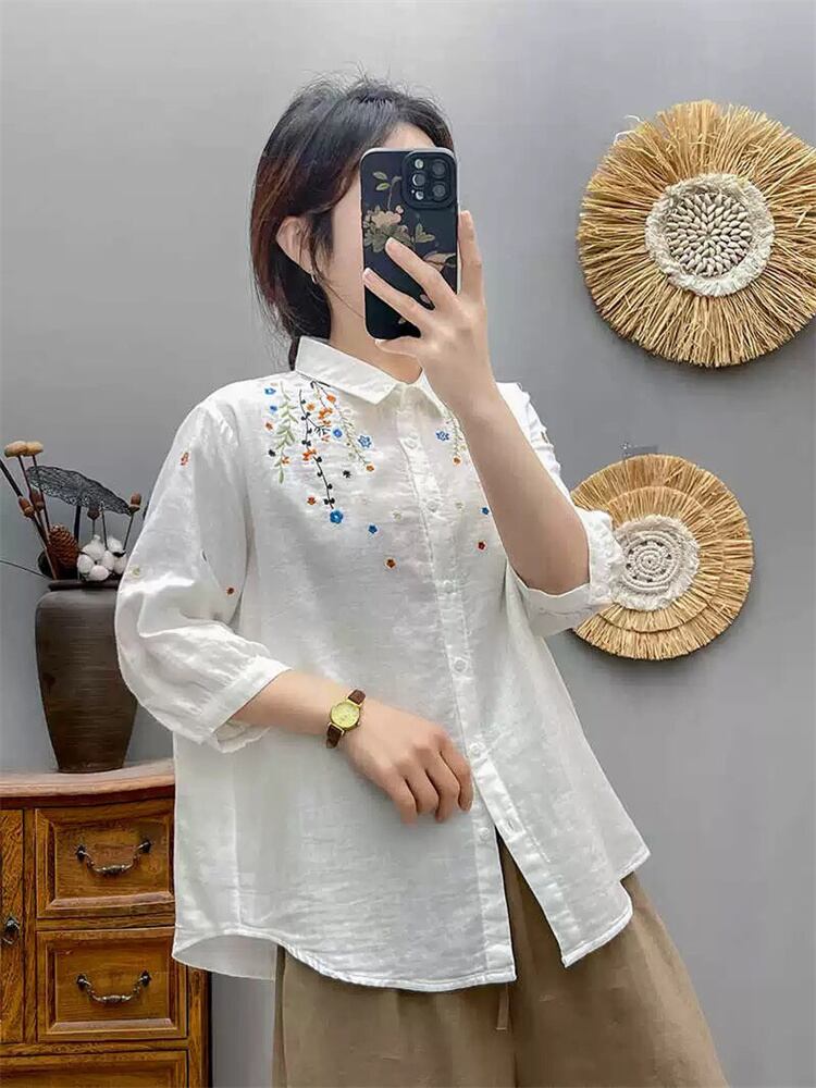 2026夏 女性用 純綿 二重ガーゼ 半袖トップス 柔らか 通気性良 刺繍デザイン N2JY2026032004 :dodo