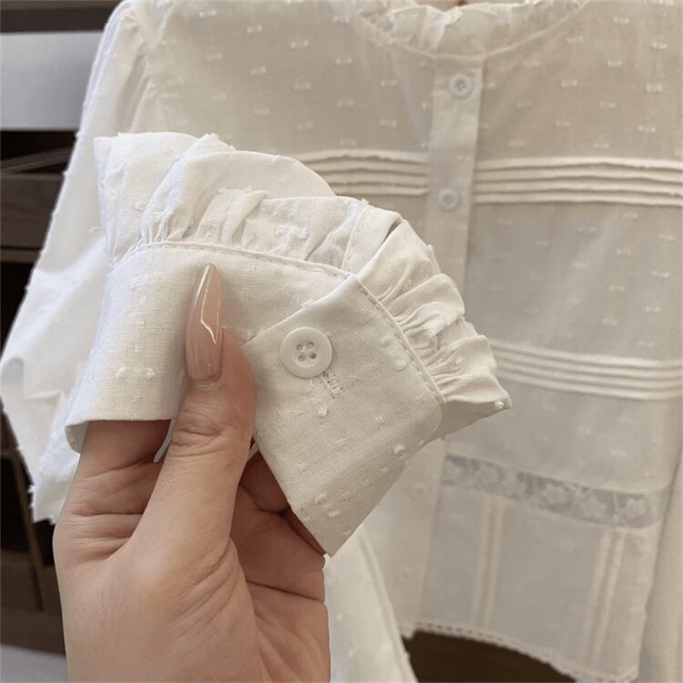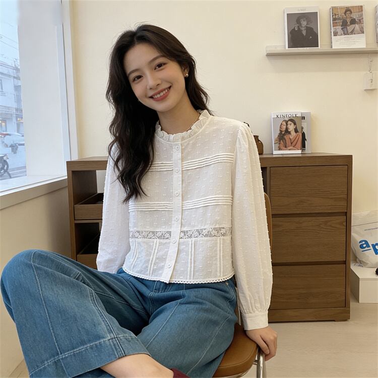 女性 フリルパッチワークレースシャツ 透かし刺繍 ゆったり長袖 ショート丈 2026春季新款