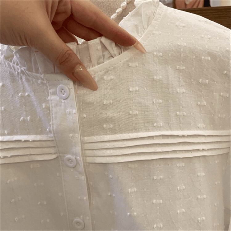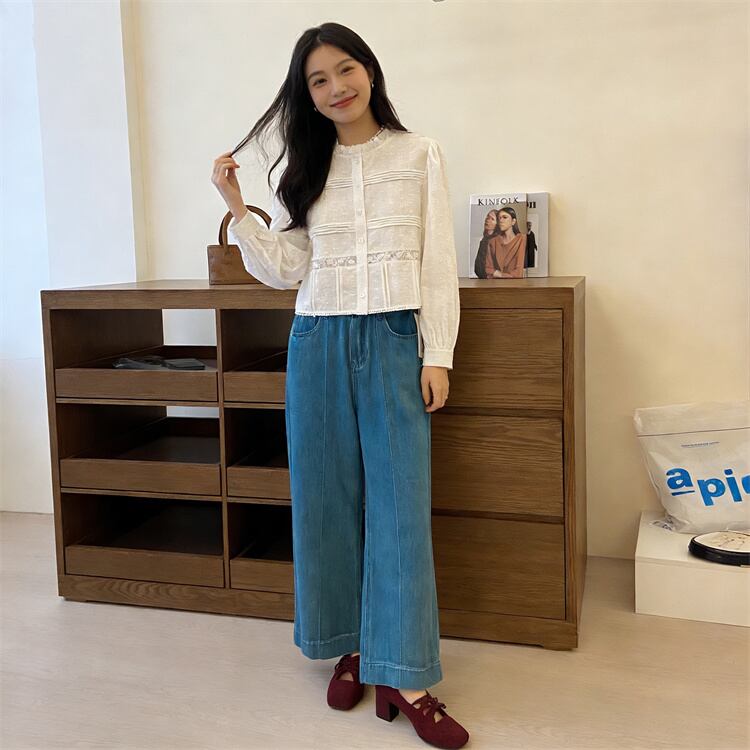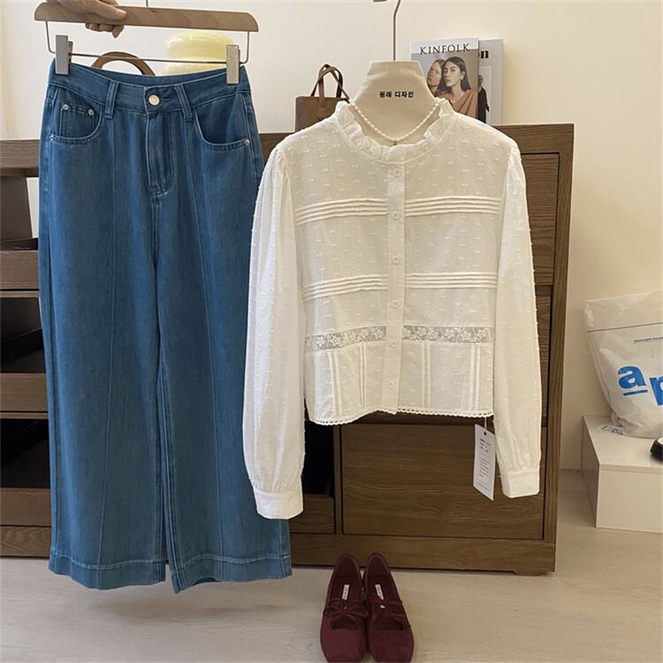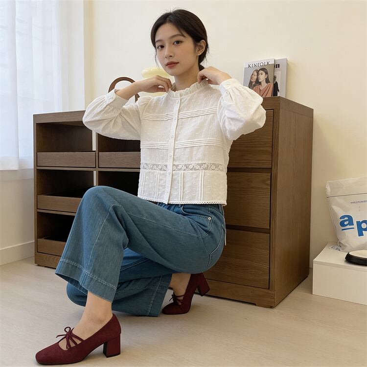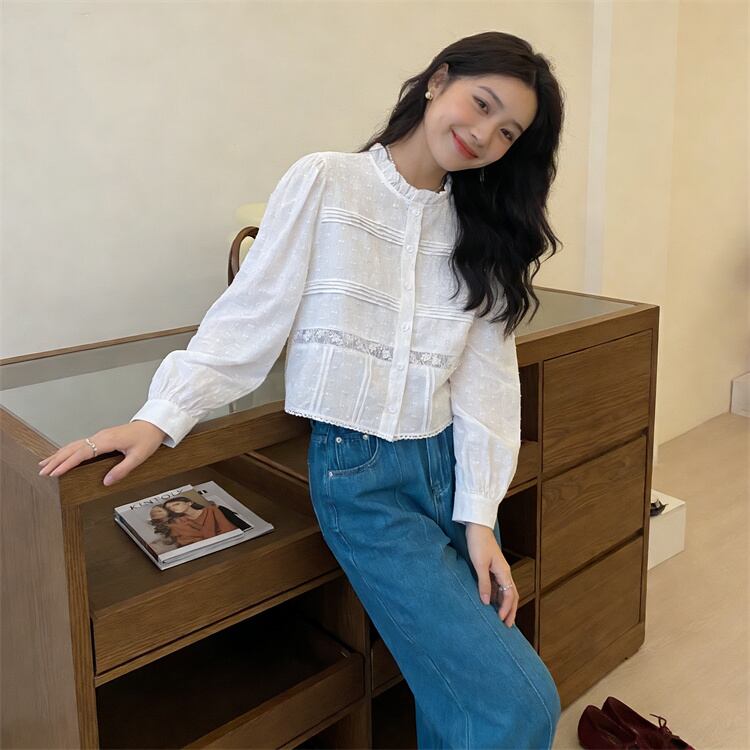 女性 フリルパッチワークレースシャツ 透かし刺繍 ゆったり長袖 ショート丈 2026春季新款 N2JY2026032003 :dodo