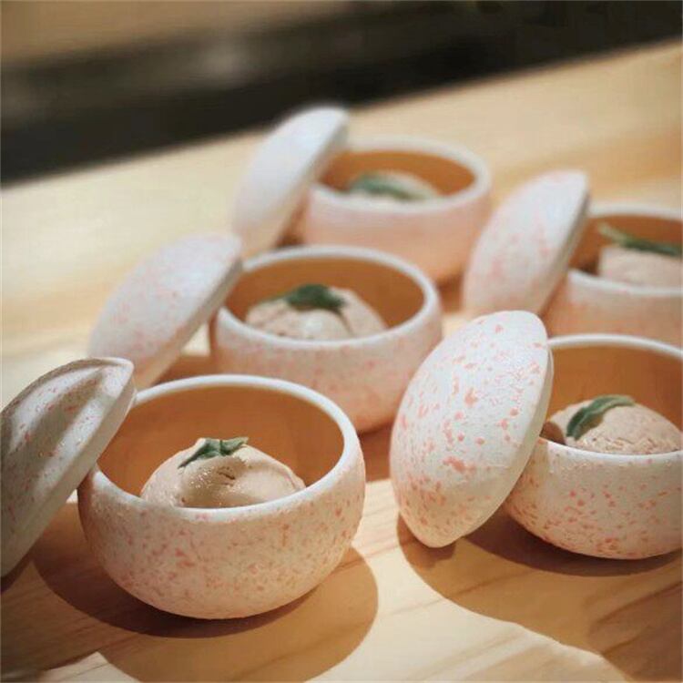 デザートを盛るのにぴったりな、創意的な円球形蓋付きセラミック盅です。