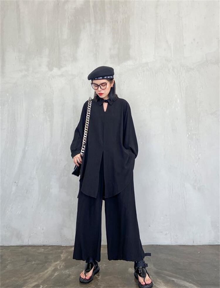 プラスサイズ対応 2026年春秋 トレンド 黒 セットアップ ゆったり長袖シャツ リラックスワイドパンツ N2JY2026032312 :dodo