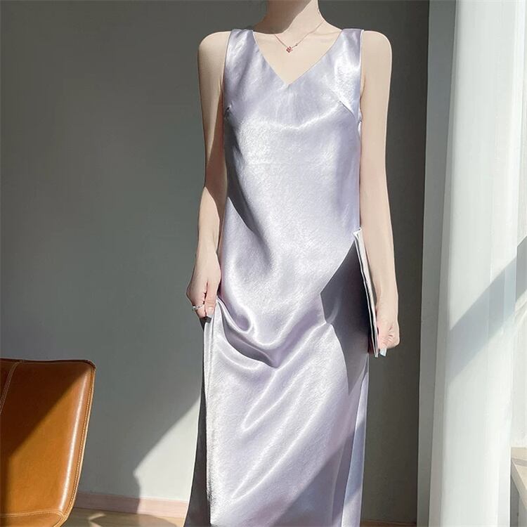 通気性良 着心地最高 夏の無袖Vネックワンピース 8色で選べるロングシルエット