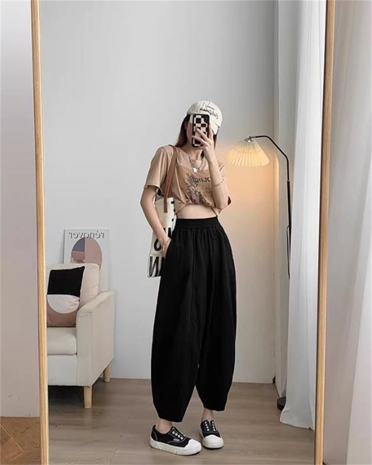 ハイウエスト ゆったり薄手ワークパンツ 夏用 9分丈 裾ゴム バルーンサルエルパンツ レディース 2026新作 N2JY2026032018 :dodo
