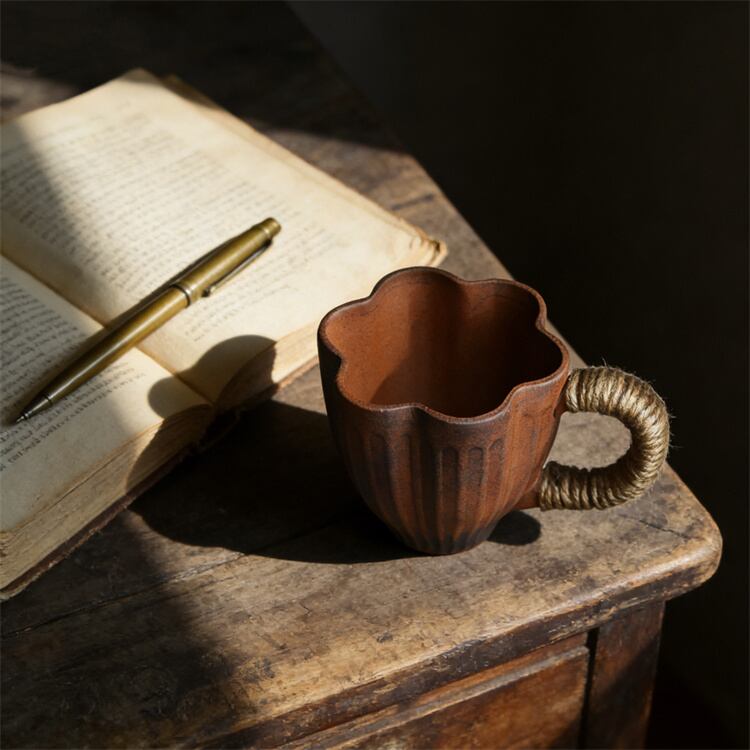 「老岩泥」という名の粗陶は、地中から採れた陶土を無釉のまま素焼きしたもので、表面には焼成時の温度と湿度が刻んだ自然の石目模様が広がっています。指でなぞると、大地の温もりが指先に伝わるような、ほんのり粗い触感が心を和ませます。はなびら形のハンドルは、握った瞬間に手のひらに馴染むように設計されており、朝の急ぎのコーヒー作りでも、夜のリラックスタイムの果汁でも、毎日の飲み物を、よりやさしく受け止めてくれます。