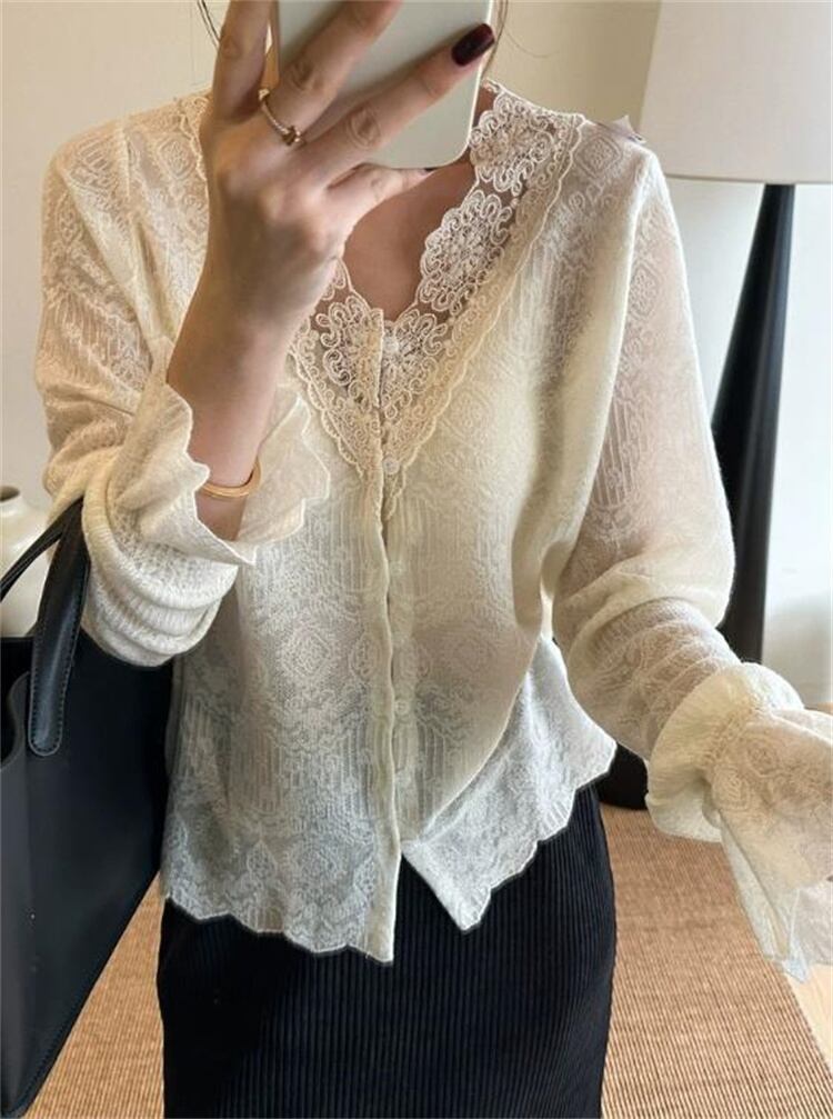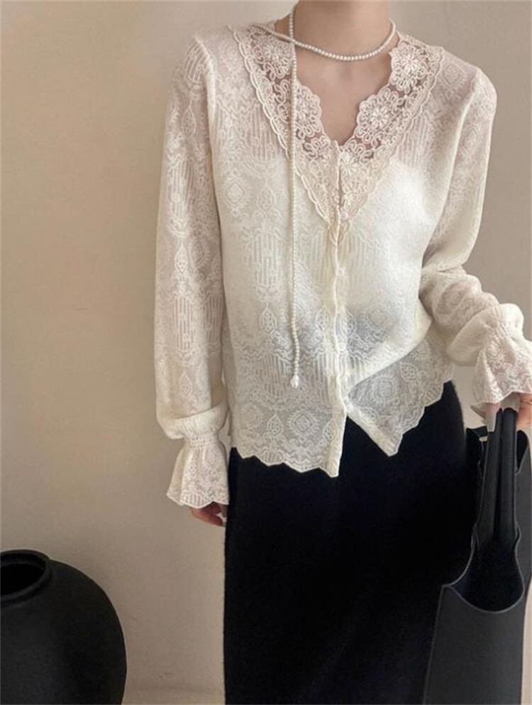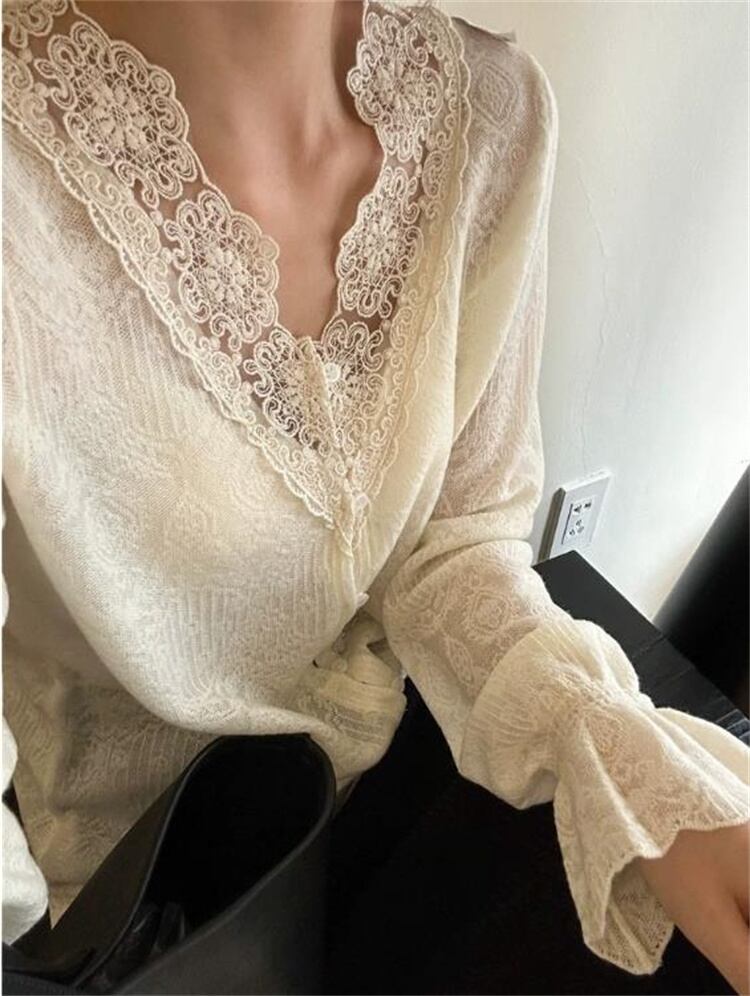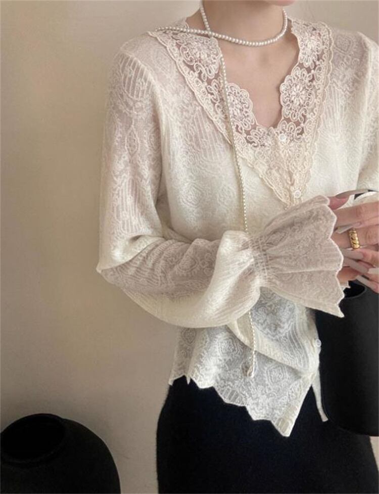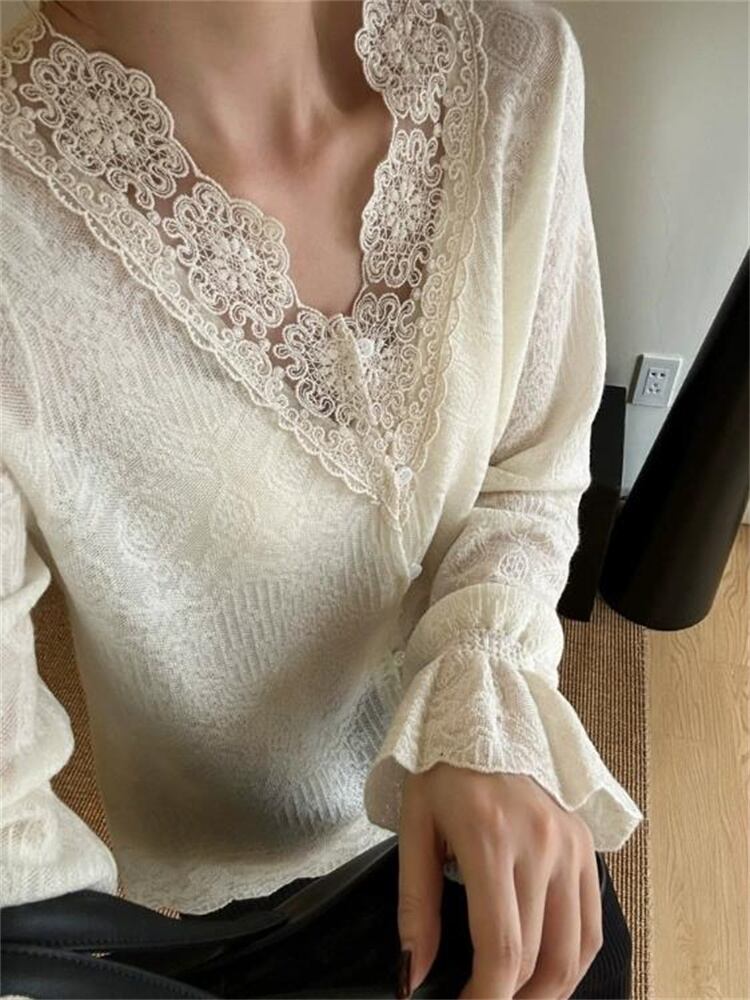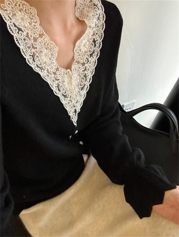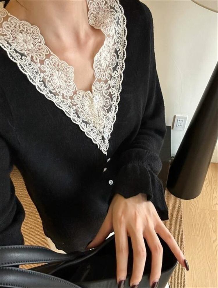 秋冬用ウールインナー 長袖 Vネックレース切り替えトップス 2色展開 N2JY2026041305 :dodo