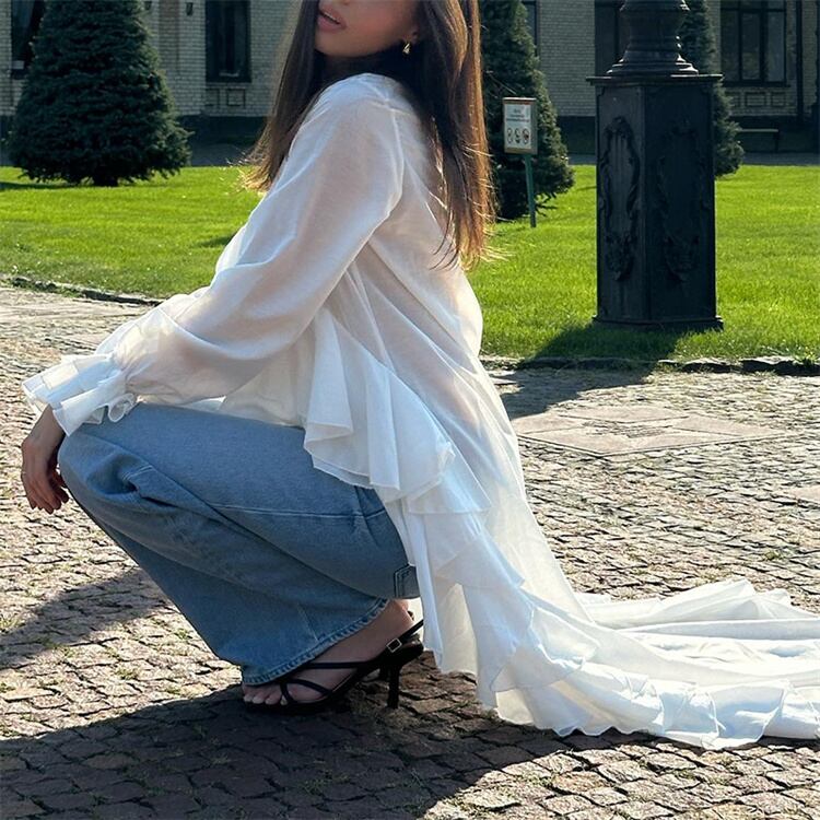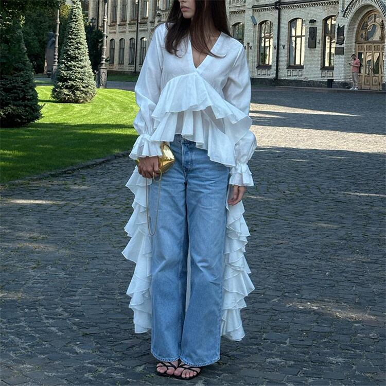 Vネックフリルシャツ ホワイト ゆったりめ アシンメトリーデザイン ビーチウォーキングに
