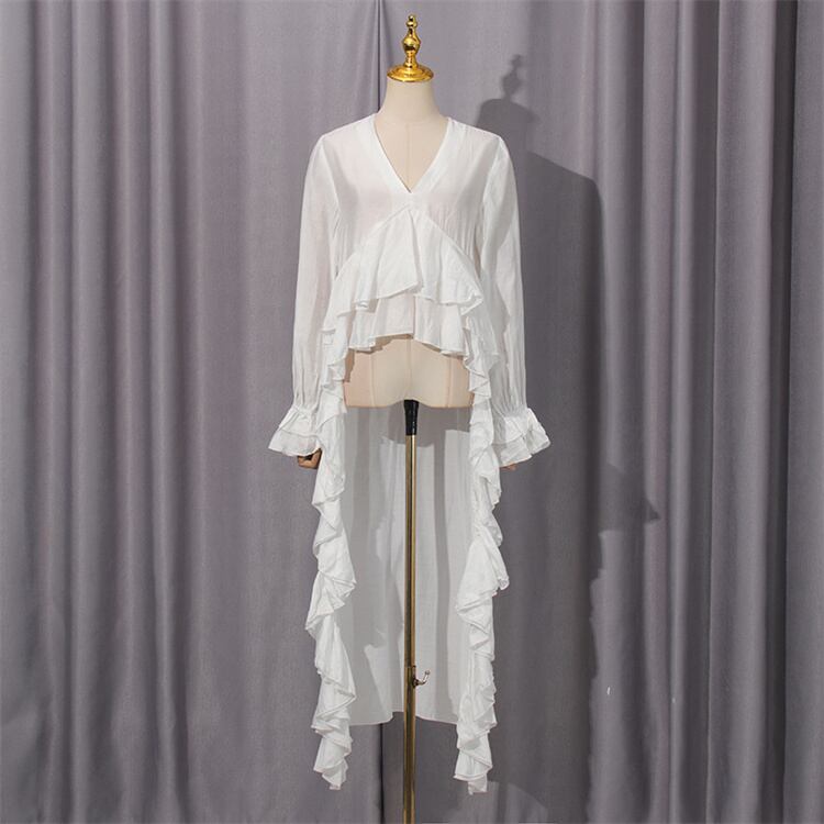 Vネックフリルシャツ ホワイト ゆったりめ アシンメトリーデザイン ビーチウォーキングに N2JY2026040713 :dodo