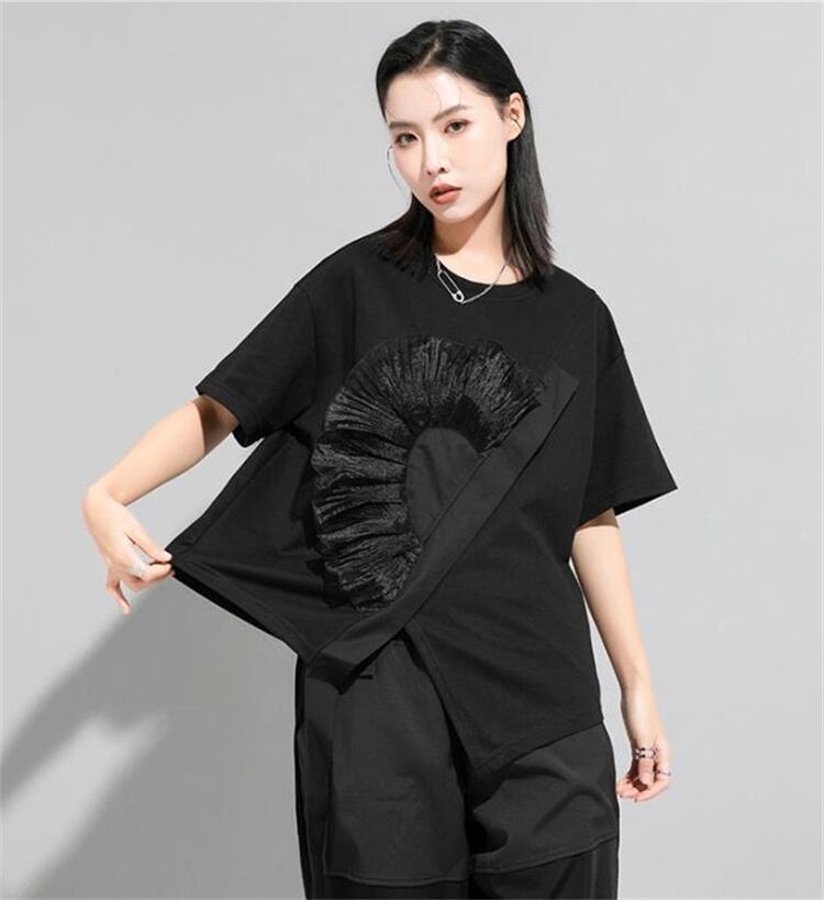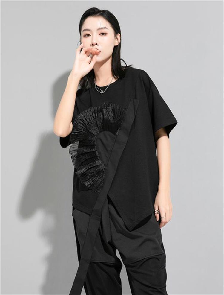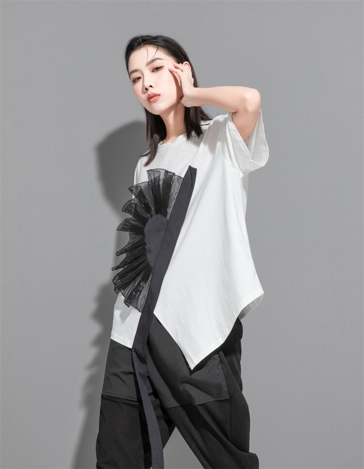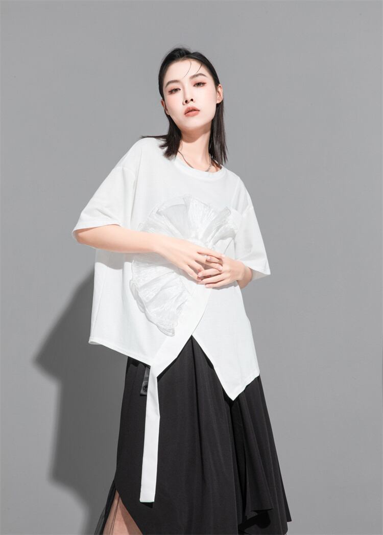 ヨーロピアンテイスト 立体フラワートップス アシンメトリー ゆったり半袖 T シャツ N2JY2026040706 :dodo