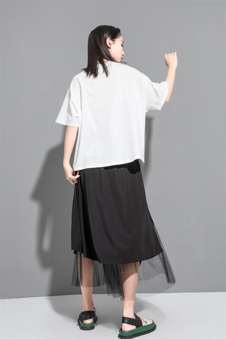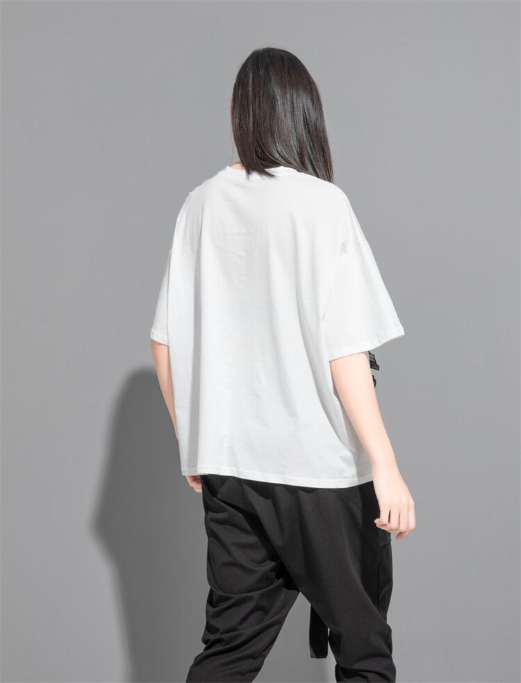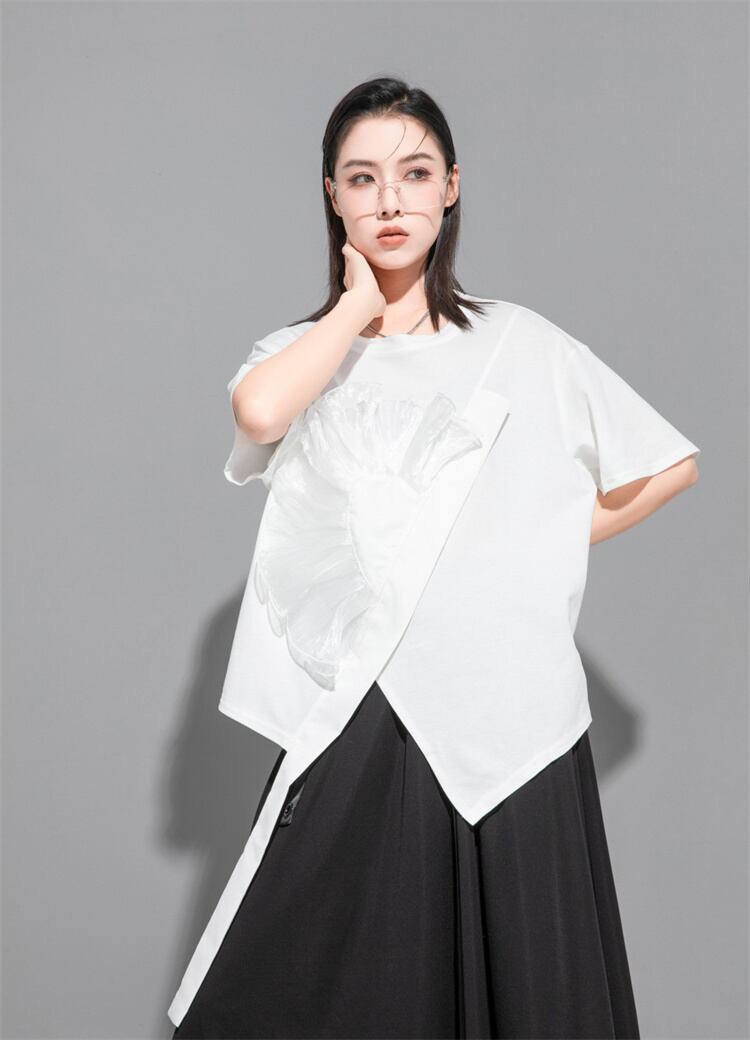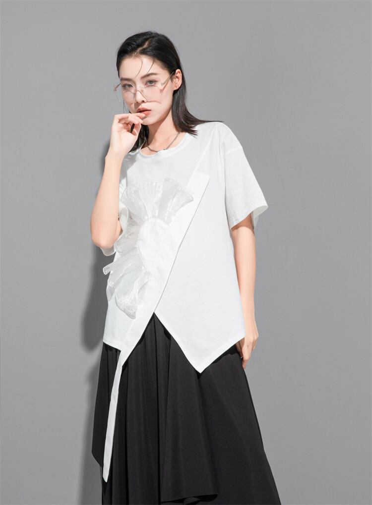 ヨーロピアンテイスト 立体フラワートップス アシンメトリー ゆったり半袖 T シャツ