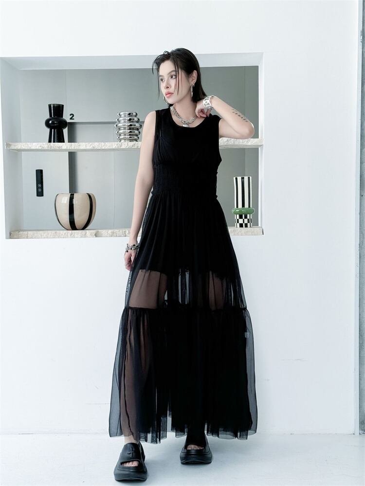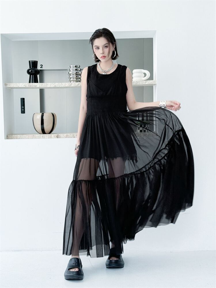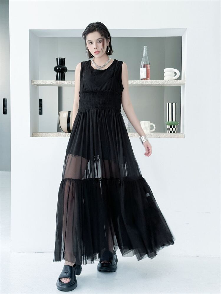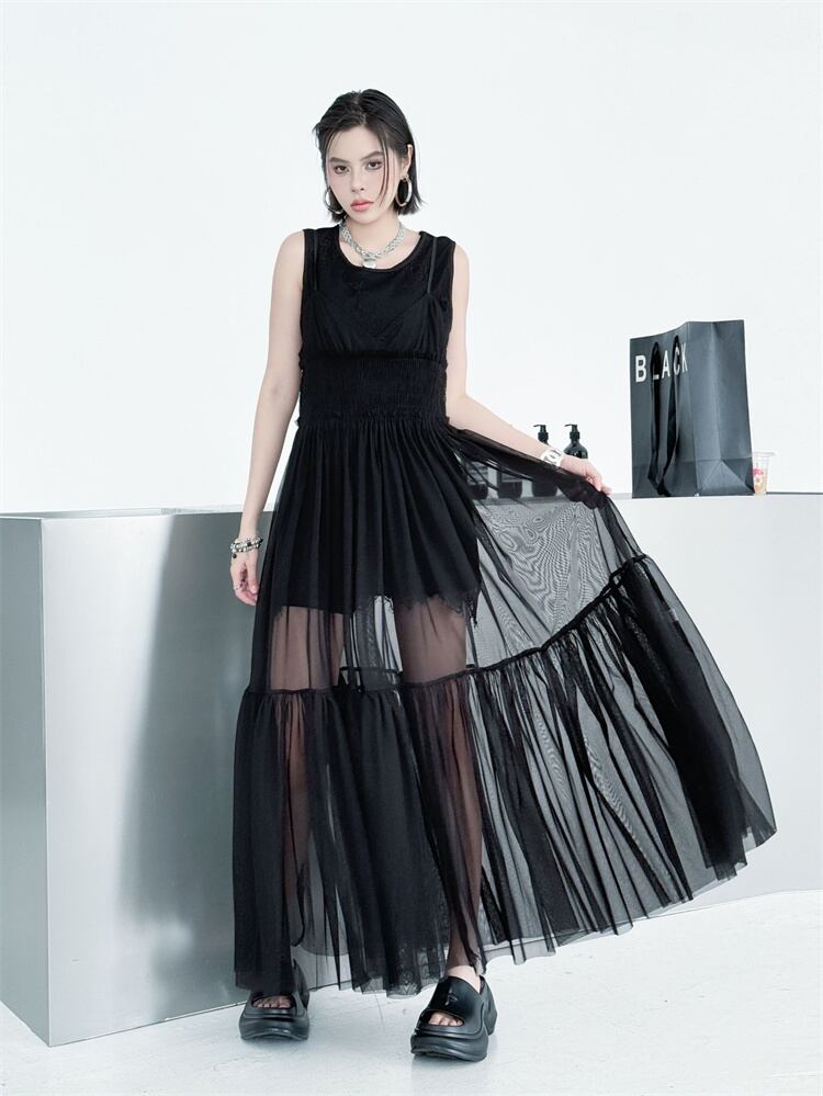 黒 メッシュ ストラップワンピース 2026夏 無袖 ロングドレス ケーキスカート 軽やか N2JY2026032328 :dodo