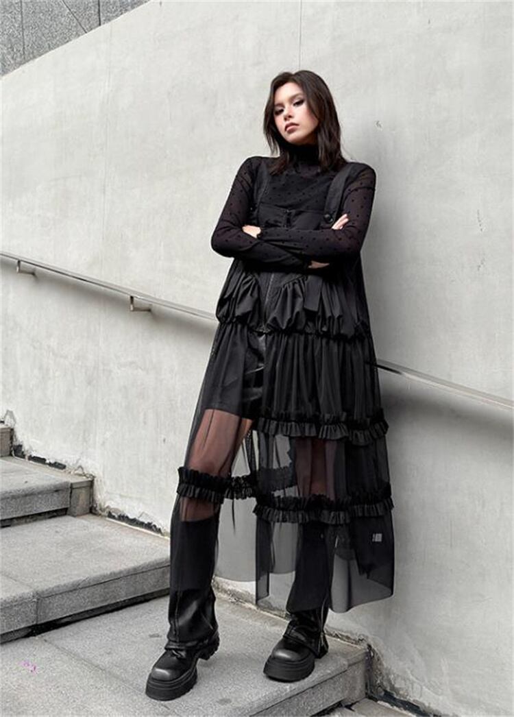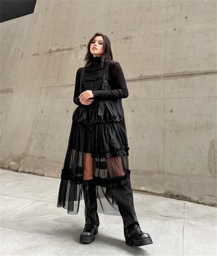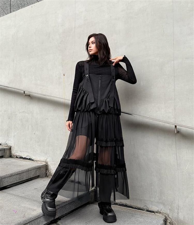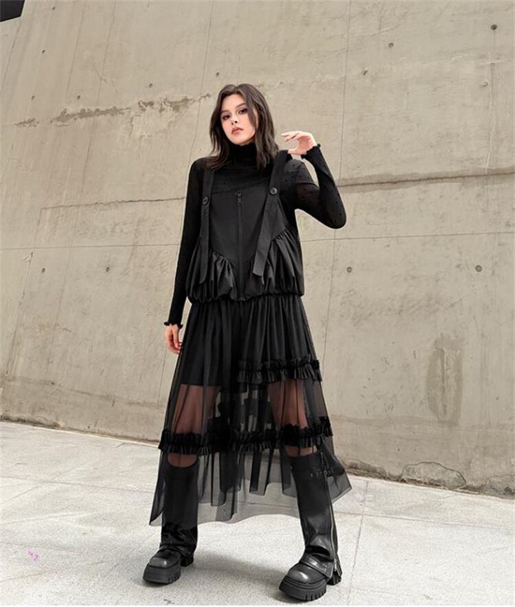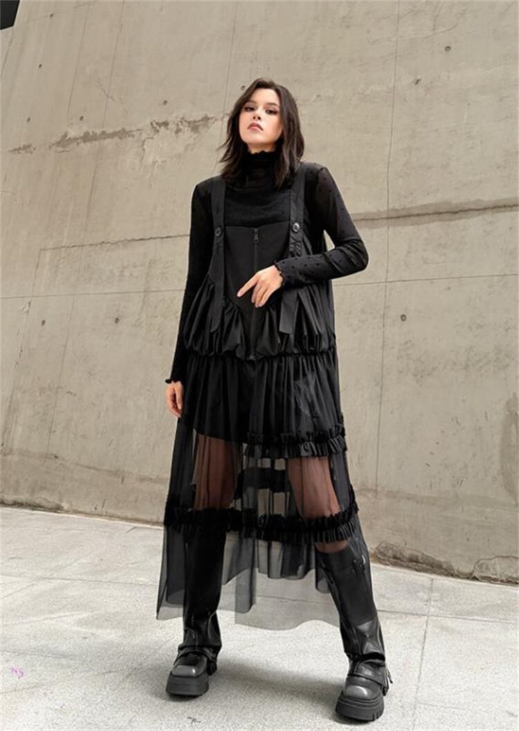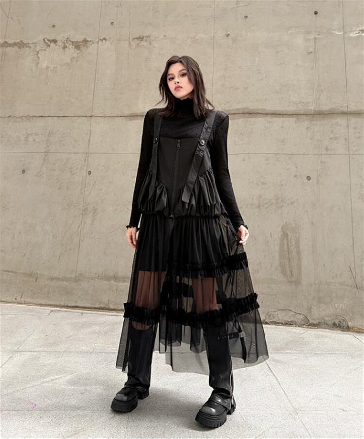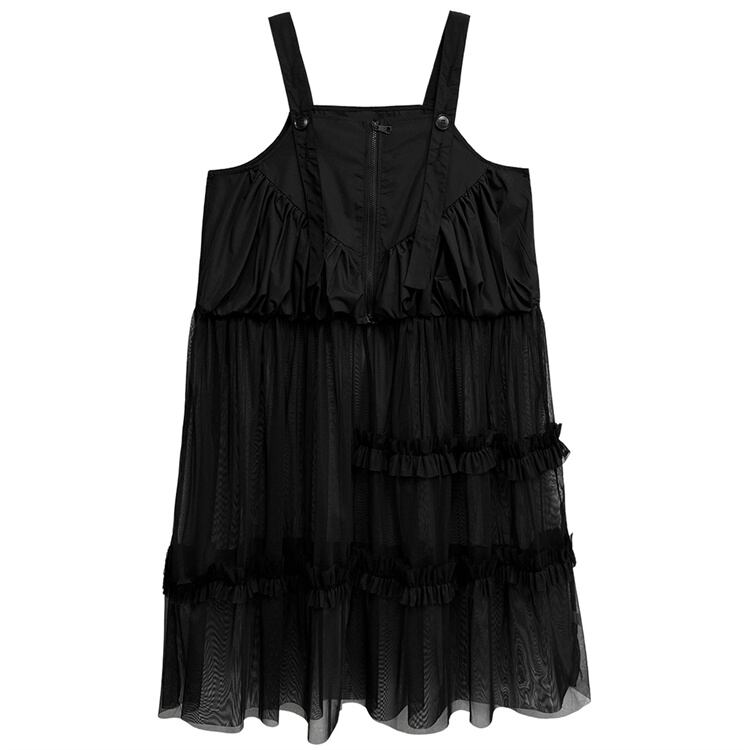 2026春新作 ブラック パッチワークメッシュ ストラップロングドレス ゆったりシルエット
