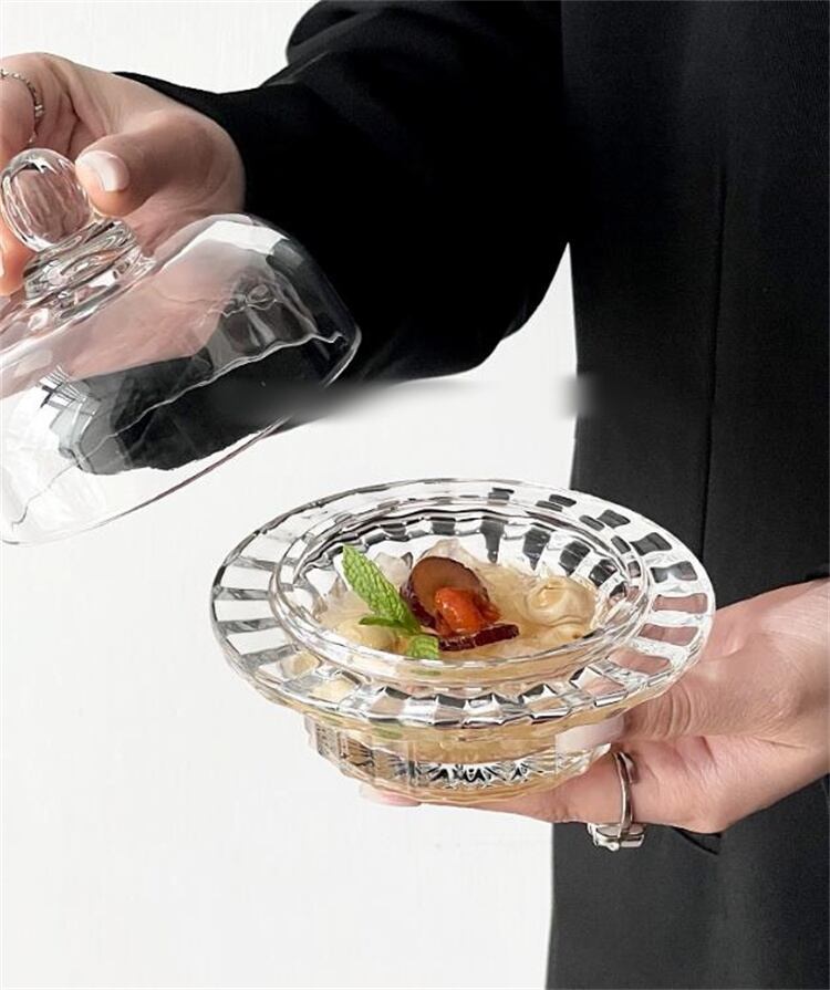 ガラスは無鉛で安全、透明感が食材の美しさを最大限に引き立てるのが特徴!燕窝の繊細なテクスチャーや、アイスクリームの濃厚な層次感、デザートのカラフルさが、見た目だけで食欲をそそります。
