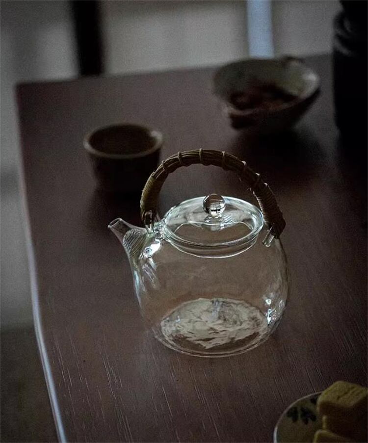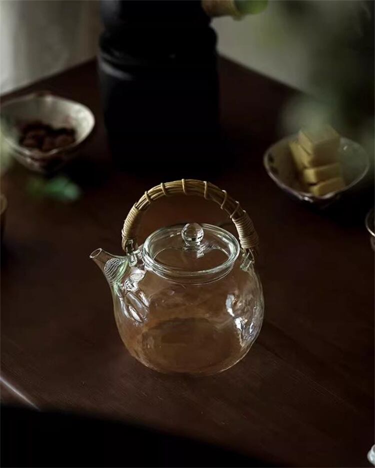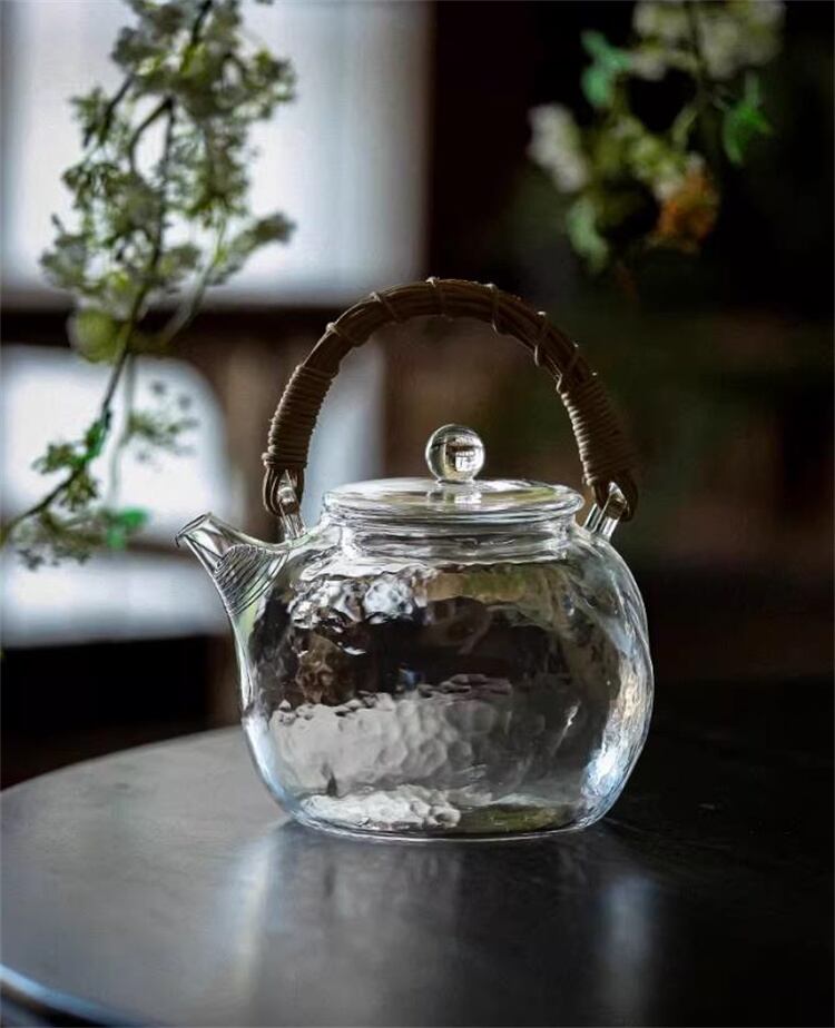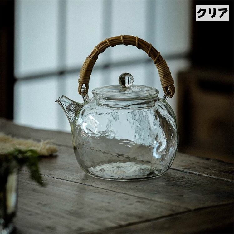 高硼珪酸ガラス提げ手ポット ハンマー模様藤編み 2色選べる 耐熱1000ml 家庭用 N2JY2026031802 :dodo
